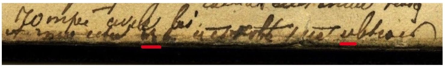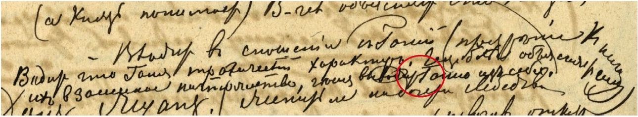 Рассмотрим один характерный пример подобного неразличения глагольных форм, когда неверное прочтение может приводить к искажению смысла всей фразы и, как следствие, к неверному фактическому комментарию. В набросках на отдельном листке к январскому номеру «Дневника Писателя» 1876 г. встречаем такие краткие записи будущих тем дневника, сопрягающие заинтересовавшую Достоевского статью русского антиковеда М. С. Куторги (Русский Вестник. 1875 г. Октябрь) с темой Франко-прусской войны и ее последствий для Франции: «Франція и 8 милліоновъ, раздроблен<ная> собствен<ность>, они не уступятъ {Прочтите о димѣ Куторги}» (ОР РГБ. Ф. 93.I.2.11/2. Л. 2 об.). Позже, в записной тетради 1875–1876 гг. (РГАЛИ. Ф. 212.1.15. Л. 17 об. — 18), эта конспективно обозначенная на отдельном листке мысль будет подробно развернута и прояснена. Выделенное нами слово, таким образом, отсылает будущего читателя к уже прочитанной Достоевским статье. Между тем в первой и долгое время единственной публикации этих набросков (Д30; т. 22: 142) «были допущены некоторые неточности, в т. ч. — в интересующей нас фразе, принявшей вид: “прочитать о диме Куторги”» [Скоропадская: 103]. Такое прочтение глагола кардинально меняет весь смысл фразы, заставляя рассматривать ее в качестве пометы писателя для себя (список книг, намеченных к прочтению) и ошибочно предполагать, что на момент появления данных набросков знакомство со статьей М. С. Куторги еще только стояло в планах (подробнее об этом см.: [Скоропадская: 102–104, 112]). Однако здесь перед нами классический образец недописанного, смазанного глагольного окончания 2 л. мн. ч. (побуквенный анализ середины слова также не дает возможности для расшифровки -читат- вместо правильной -чтит-) (см. Илл. 5):