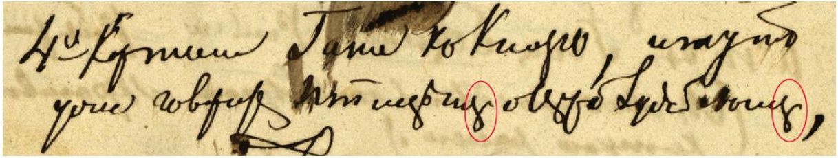 Графический анализ других слов из записной тетради, грамматическая форма которых оканчивается на «ъ», показывает, что данное начертание является одним из вариантов этой буквы в почерке Достоевского. При сравнении написаний «ъ» и «у» обнаруживается, что ошибка прочтения могла быть допущена публикаторами по причине схожести нижнего элемента этих букв: в виде петли с росчерком. Однако у «ъ» отсутствует начальный элемент, который имеет буква «у» (см. Илл. 7). При внимательном рассмотрении он отсутствует и у буквы в окончании фамилии героя Достоевского. Из этого следует, что необходимо читать окончание слова иначе: «говоритъ Птицынъ о Царѣ Iудейскомъ».