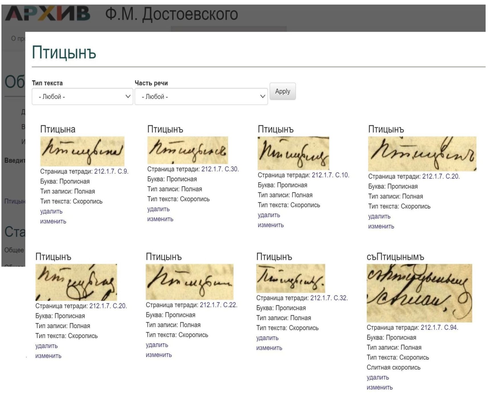 Сегодня в подобном системном анализе общих, типичных, свойственных в целом почерку Достоевского особенностей начертаний может помочь не только работа непосредственно с рукописями и их исследовательскими расшифровками, но также обращение к электронному каталогу графических образцов рукописного текста на портале «Архив Ф. М. Достоевского» (http://dostoevsky-archive.ru/). Создаваемый комментированный корпус графики изначально обеспечивал развитие инструментальной платформы для интеграции дальнейших проектов и решения новых научных задач: расширения, дополнения инструментария, прописывания новых функций, потребность в которых обнаруживается не сразу, а по мере наполнения каталога и в процессе неизбежно сопутствующего данной работе нового углубленного анализа текстов записных тетрадей. В 2022-м году инструментарий каталога графических образцов пополнился функцией расширенного поиска — по тем параметрам, по которым слово описывается при занесении его в базу [Тарасова, 2022: 7–8] (см. Илл. 3).
