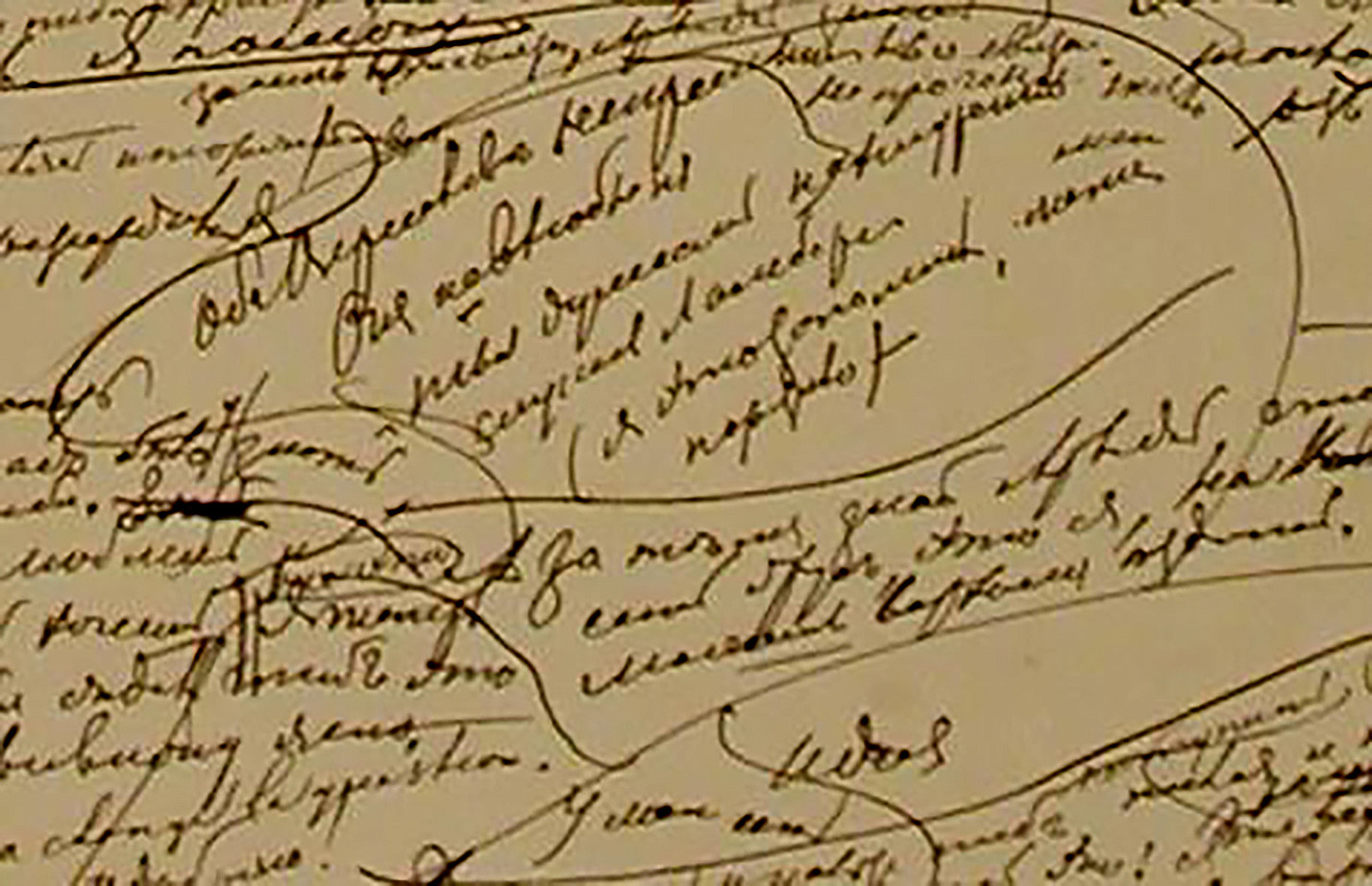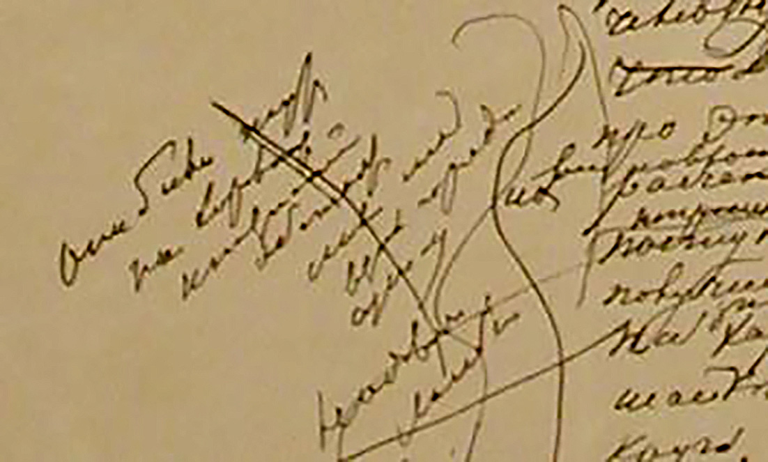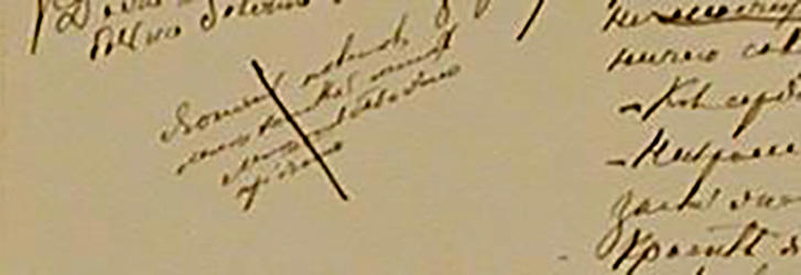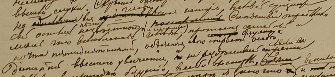 - Вычеркнутая запись-маргиналия (шестая глава второй части):