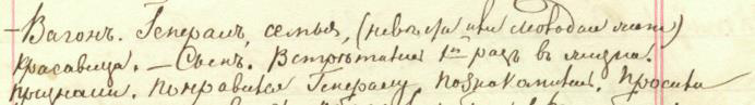 «— Вагонъ. Генералъ, семья, (невѣста или молодая жена) Красавица. — Сынъ. Встрѣтились 1й разъ въ жизни. Признали <В Д30 и в 1931: Признание — 9, 162; 34>».