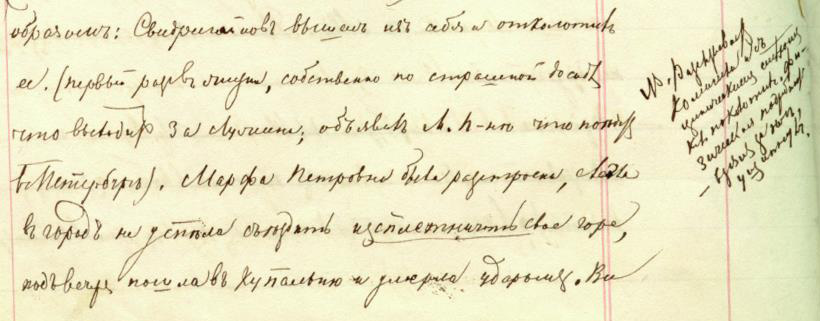 «Марфа Петровна ему позволяла крѣпостныхъ, только чтобы онъ сказывался. Вотъ только насчетъ Дунечки возмутилась./