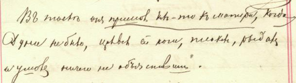 В слове «ушолъ» присутствует характерное для почерка Достоевского нижнее подчеркивание буквы «ш» (см. выше в этом же предложении слово «пришолъ»). Перед нами краткая характеристика героя, который в порыве отчаяния приходит к матери, но ничего не может ей рассказать и, так и не объяснившись, уходит.