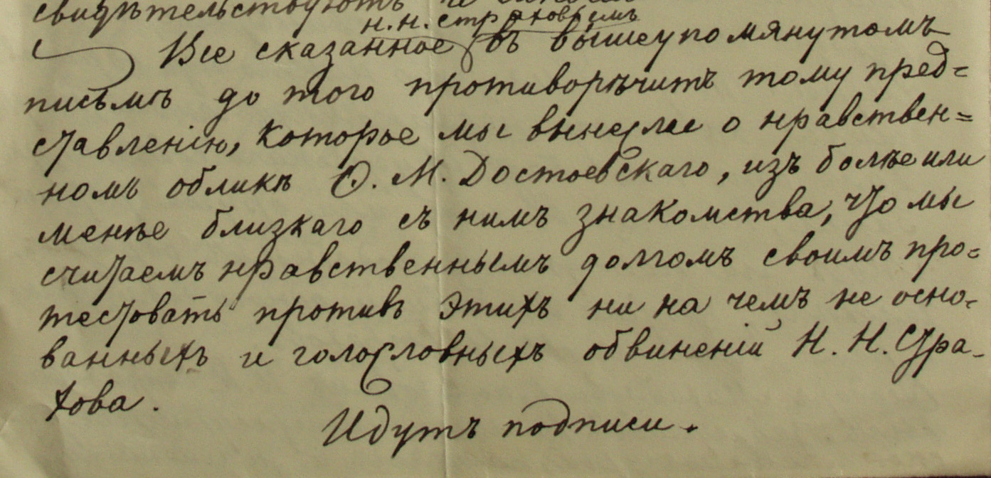Все сказанное Н. Н. Страховымъ 27 въ вышеупомянутомъ письмѣ до того противорѣчитъ тому представленiю, которое мы вынесли о нравственномъ обликѣ Ѳ. М. Достоевскаго, изъ болѣе или менѣе близкаго съ нимъ знакомства, что мы считаемъ нравственнымъ долгомъ своимъ протестовать противъ этихъ ни на чемъ не основанныхъ и голословныхъ обвиненiй Н. Н. Страхова.