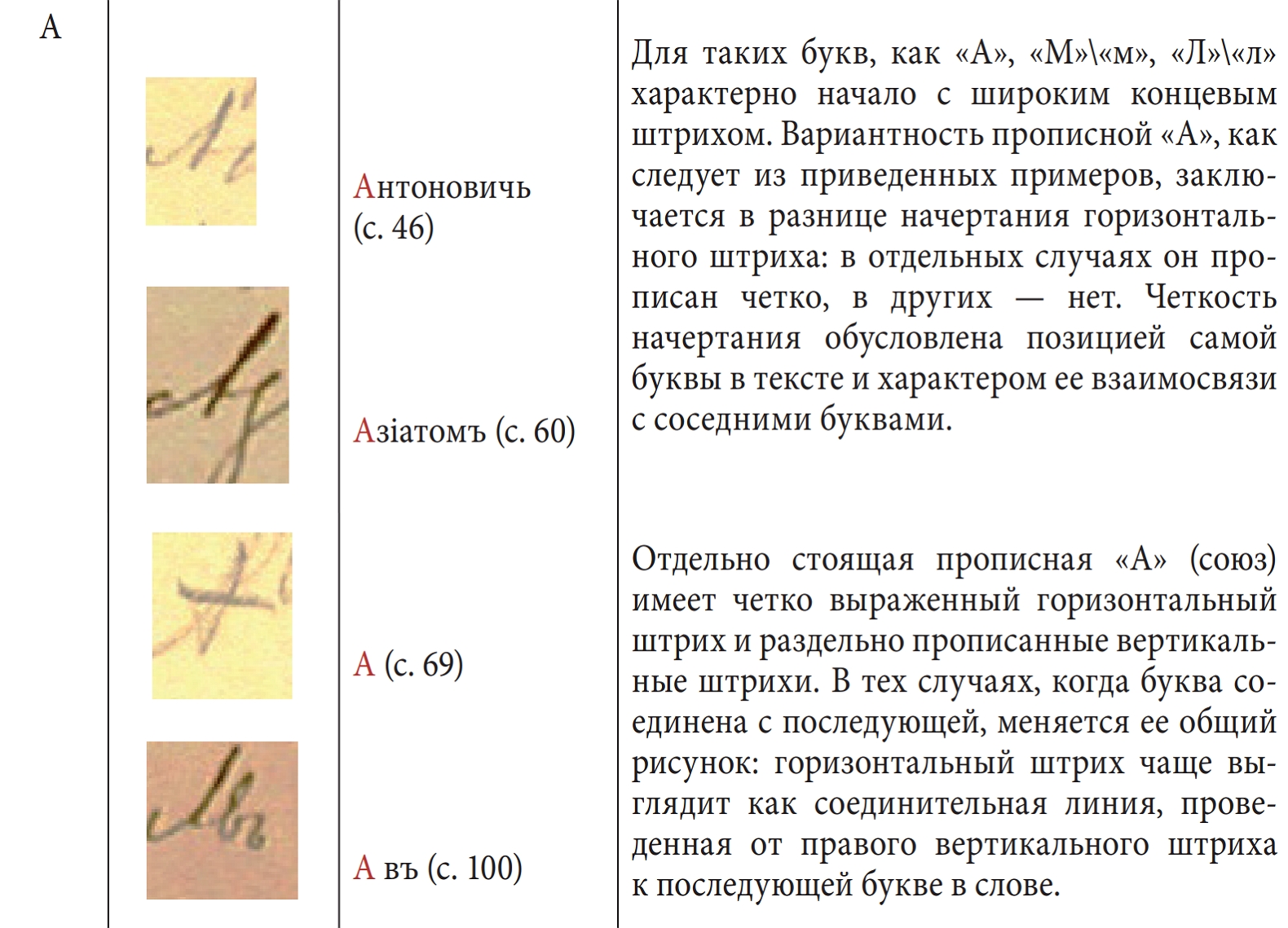 В приведенных же выше (со с. 109 ЗК) трех вариантах написания буквы «и» характерно то, что все примеры находятся в непосредственной близости друг от друга, на одной странице, в соседних предложениях. Поэтому объяснить разницу в начертаниях буквы «и» (более частотный вариант, с длинным высоким росчерком, и реже встречающийся, с полуовалом) невозможно ни разными типами документа, ни особенностями скорописи (все слова были написаны одномоментно), ни особыми условиями письма (непривычной позой, некачественной бумагой, разными видами инструментов для письма, плохим освещением, физическим недомоганием, расстройством и пр.). Все перечисленные выше условия были идентичны во всех трех примерах, тем не менее возникли разные варианты начертания буквы. Это обусловлено только самой особенностью выработанного почерка: существованием в нем большого количества вариантов написаний одного и того же знака. Данный пример, как и все другие, приведенные выше примеры, достаточно ясно указывает на проблемы расшифровки почерка Достоевского. Основные причины возникновения ошибок прочтения рукописного текста — это неразграничение начертаний, неверное их зрительное восприятие, чтение слов по «общему рисунку», неточное распознавание типичных графических признаков конкретных букв, недостаточная опора на семантику фразы. Таким образом, небесполезной оказывается работа по систематизации начертаний и составлению своего рода «графической азбуки» — описания букв в почерке Достоевского в алфавитном порядке.