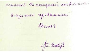 Чтобы развеять могущие возникнуть сомнения, что вообще все окончания писем, особенно не дружеских, а полуофициальных, обращенных к почти незнакомым лицам, писались в XIX в. по определенному шаблону и, следовательно, были однообразны, приведем, для сравнения, образцы концовок писем двух других людей, чтобы показать, что и эта часть письма, несмотря на её кажущуюся формульность, устойчивый характер и ожидаемое единообразие, может служить (и служит) одним из основных идентифицирующих признаков при почерковедческой экспертизе и носит признаки индивидуальности каждого корреспондента.