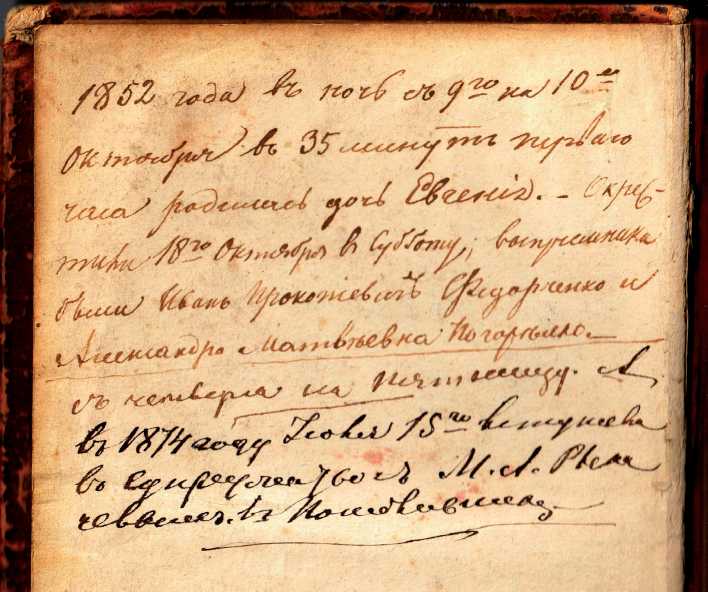 «1852 года въ ночь съ 9го на 10е Октября въ 35 минутъ перваго часа родилась дочь Евгенiя. — Окрестили 18го Октября въ Субботу; воспрiемники были Иванъ Прокопiевичъ Федорченко и Александра Матвѣевна Погорѣлко.