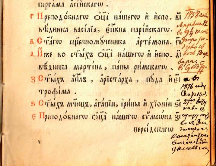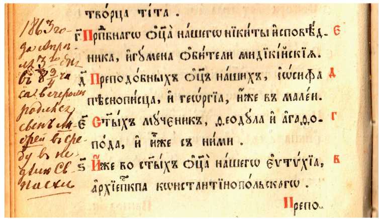 13 Первая запись, сделанная во всю ширину страницы на обороте свободного листа переднего форзаца, не является в строгом значении «маргиналией», но приобщаю и ее к последующим маргиналиям в собственном смысле, помещенным на полях «Месяцеслова».