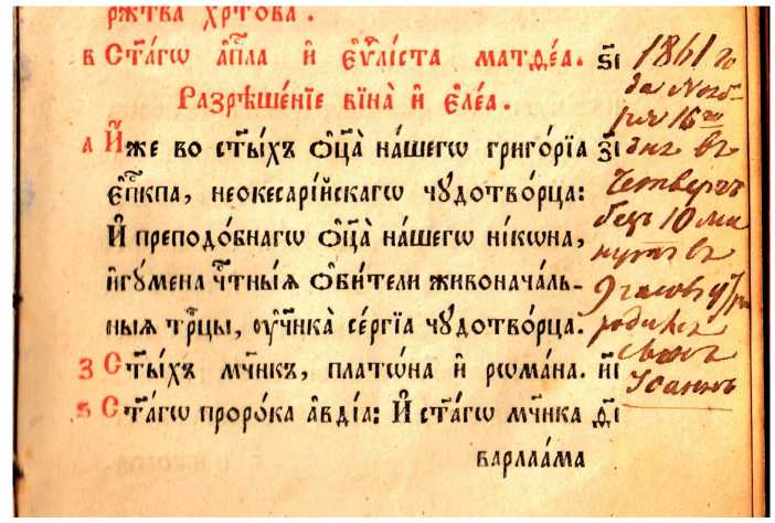 Чем же замечательна эта книга, кроме того, что попала в семью Андрея Михайловича Достоевского из рук «святого доктора» Ф. П. Гааза? Прежде всего, памятными маргиналиями, которые делались владельцем на страницах «Месяцеслова». Из содержания записей, касающихся важнейших событий в жизни детей А. М. Достоевского, непреложно следует, что все они сделаны родительской рукой. Чьей: самого брата писателя или его супруги Домники Ивановны (урожд. Федорченко; 1825–1887)? Почерк на разных страницах «Месяцеслова» вариативен. Но обращение к автографам Д. И. Достоевской позволяет заключить, что это не ее рука. Приходится сделать вывод, что все маргиналии внесены в книгу Андреем Михайловичем. В большинстве случаев его весьма характерный почерк опознается без труда. В тех же случаях, когда бросается в глаза графическое несходство отдельных записей, нужно помнить, что они вносились на поля «Месяцеслова» в течение нескольких десятилетий, то молодым отцом, то человеком весьма преклонных лет, и пишущий пребывал в существенно различных состояниях — как в умилении и восторге, так и в отчаянии. Цвет чернил, качество пера также влияют на графический облик маргиналий.