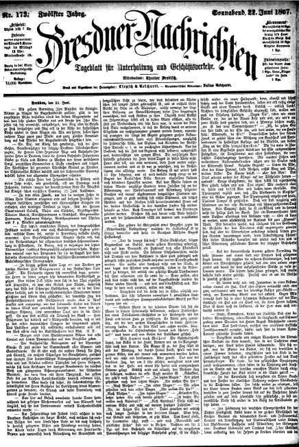 Илл. 6. Первая страница газеты «Dresdner Nachrichten» за 22 июня 1867 г. с заметкой о посещении А. Г. Достоевской заседания стенографического сообщества16 стенографистка произвела впечатление на немецких коллег.