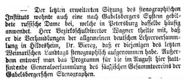 Познакомившись с супругами Достоевскими, немецкий стенограф пригласил их на заседание Стенографического института, но писатель решил отказаться от посещения «такого специального собрания», и Анна Григорьевна присутствовала там одна [Достоевская, 2015: 209]. Молодая русская