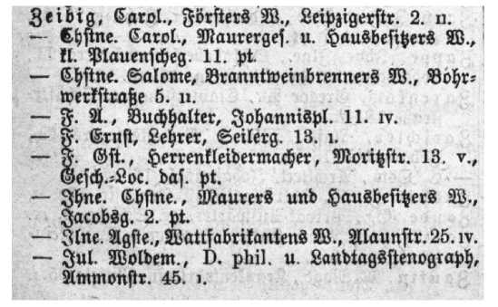 С Ю.-В. Цайбигом А. Г. Достоевская, согласно записям в ее дневнике, встречалась несколько раз. Бывала и на его квартире на Ammonstrasse 45: первый раз Анна Григорьевна отправилась по этому адресу 29 апреля (11 мая) 1867 г. с целью познакомиться с дрезденским стенографом, но она «дошла до Ammonstrasse. <…> …нашла квартиру Z<eibig>, позвонила и от служанки узнала, что его дома нет» [Достоевская, 1993: 22]; второе посещение — прощальный визит, который нанесла жена писателя в день отъезда из Дрездена 3 июля (21 июня) того же года: «Я взяла на площади карету и велела ехать в Ammonstrasse №45. <…> Он <Цайбиг> был дома, был очень рад, что я приехала» [Достоевская, 1993: 113–114]. Именно эту квартиру Цайбиг занимал в 1867 г., что подтверждает обнаруженная нами адресная книга Дрездена за этот год20 (см. Илл. 9).