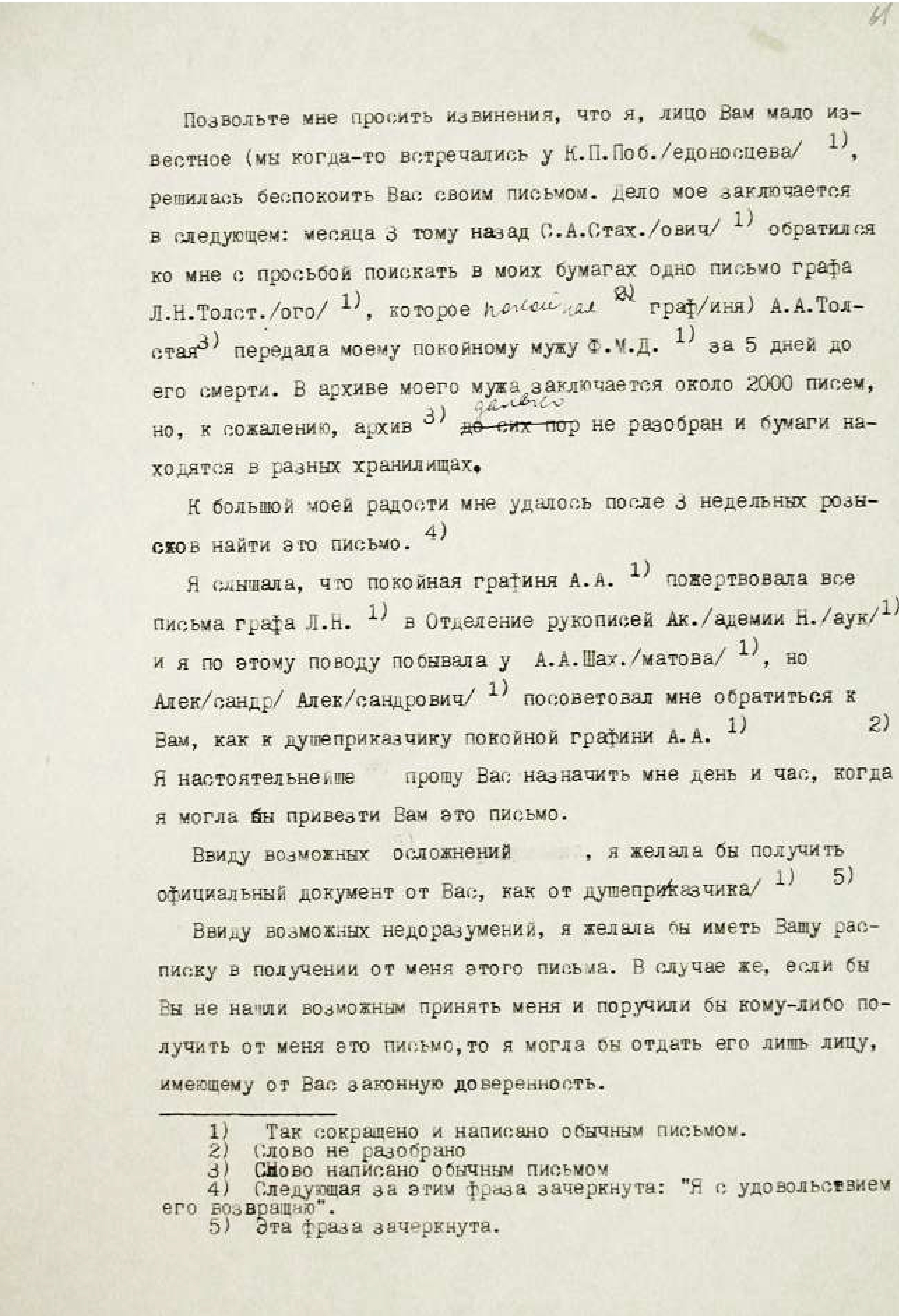 Очень признателенъ Вамъ за Ваше любезное письмо, отъ 3 с. м., и выраженное Вами намѣренiе передать мнѣ упоминаемое Вами письмо гр. Льва Николаевича Толстого къ графинѣ Александрѣ Андреевнѣ Толстой, переданное ею, для прочтенiя, Вашему супругу, незадолго до его кончины, и теперь отысканное Вами въ бумагахъ почившаго Ѳеодора Михайловича. Для полученiя этого письма и врученiя Вамъ моей росписки въ полученiи его, прошу позволенiя быть у Васъ завтра около 6ти часовъ. Упоминаемое письмо подлежитъ прiобщенiю къ остальнымъ письмамъ графа Льва Николаевича къ графинѣ Александрѣ Андреевнѣ, пожертвованнымъ и переданнымъ ею Императорской Академiи Наукъ, для храненiя и изданiя распоряженiемъ Академiи, послѣ смерти гр. Льва Николаевича.
