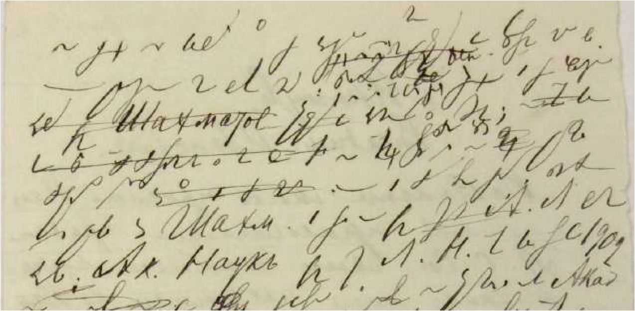 Если Галкин-Враской как адресат одной из стенографических записей устанавливается по содержанию белового автографа А. Г. Достоевской, то корреспондентов, к которым относятся две стенограммы на обороте писем к В. И. Немировичу-Данченко, установить сложнее. Беловых писем вдовы со схожим содержанием нам неизвестно. Расшифровка первого стенографического черновика затруднена большим количеством исправлений и поправок; более того, некоторые предложения не закончены Анной Григорьевной и оборваны на полуслове (см. илл. 2).