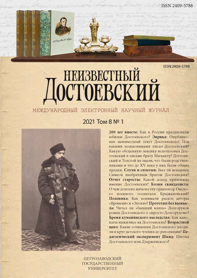 В 2021 году исполняется двести лет со дня рождения Достоевского и сто со- рок лет его бессмертию. Литературные юбилеи сравнительно недавно вошли в культуру России. Обычно отмечали память тех, кто уже обрел вечность. Попытка празднования трехсотлетия Шекспира (1864) и празднование столетия со дня рождения Пушкина (1899) положили начало новой культурной традиции. Даты литературных юбилеев в ХХ веке отражают борьбу этих тенденций: дни рождения постепенно вытесняют дни поминовения. Как правило, юбилеи являются поводом не только для осмысления значения писателя в современном мире, но и для анализа тенденций и перспектив изучения его наследия. В статье дан обзор прошедших юбилеев Достоевского в России, анализ некоторых статей первого номера журнала «Неизвестный Достоевский» за 2021 год. Особенностью двух- сотлетнего юбилея Достоевского является конкурс Российского фонда фундаментальных исследований (РФФИ) «Источники и методы в изучении наследия Ф. М. Достоевского в русской и мировой культуре» (2018–2021), в результате которого было поддержано 28 проектов ведущих ученых России. Их итогом будет издание беспрецедентной библиотеки исследований по биографии, философии, творчеству, текстологии и поэтике Достоевского. В постсоветской России очевиден разрыв достоевсковедения и массового сознания, науки и образования, по-прежнему действуют технологии противодействия влиянию Достоевского на современного русского человека. Чтение и изучение Достоевского остаются привилегией филологов, число которых в университетах катастрофически сокращено без каких-либо перспектив развития непрерывного гуманитарного образования. Тем не менее, вопреки властным оппонентам, Достоевский представляет Россию, Карамазовы — самая известная русская фамилия, и сегодня, как полтора столетия назад, пророк и апостол Достоевский несет слово правды и истины в мир.