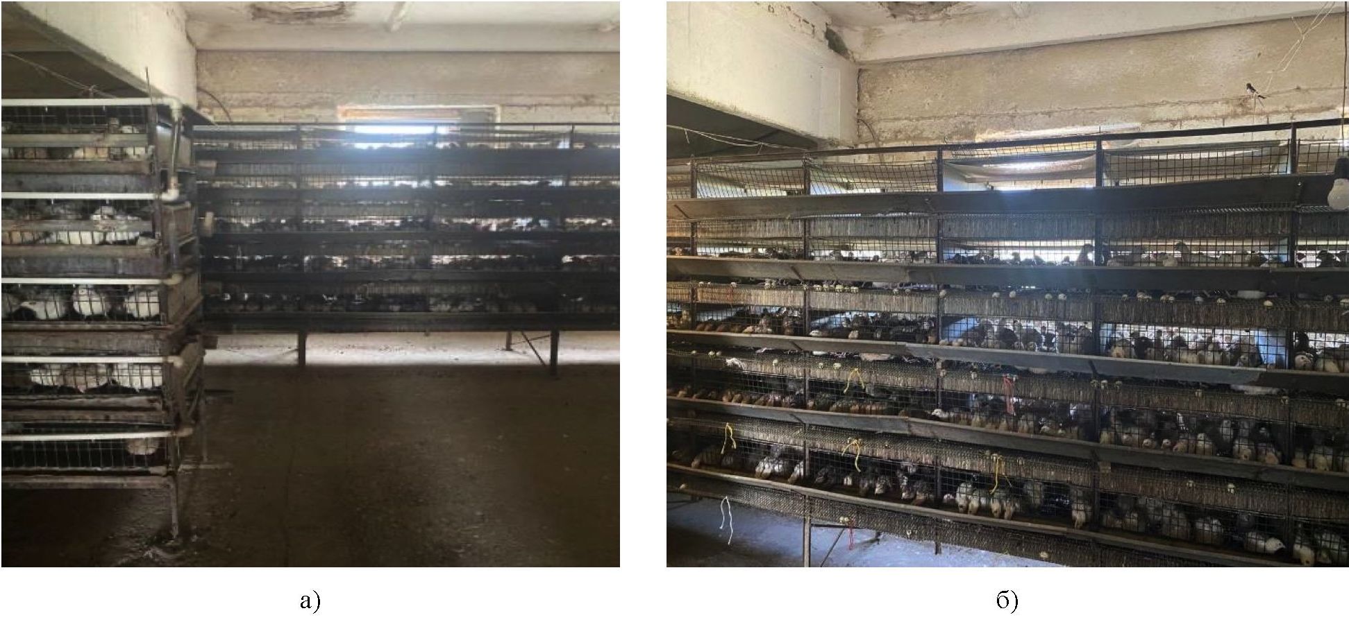 Рис. 1. Условия содержания перепелов: а) многоярусные клетки с перепелами б) экспериментальные группы