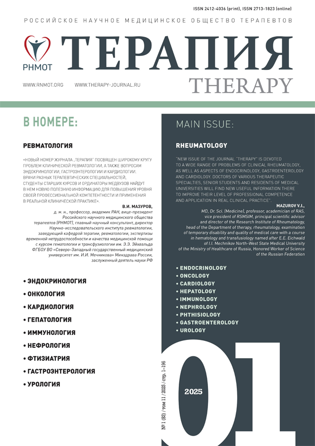 Results. Patients with RA included in the study received GC therapy at a median dose of 5[2.5; 20] mg equivalent to prednisolone. Most of them (73.9%) were on low doses of prednisolone (≤ 7.5 mg per day), 26.1% were taking medium doses of prednisolone (> 7.5 and ≤ 30 mg per day). The median duration of GC use was 30 months (6; 264). A comparative analysis of the main steroid metabolites was performed between patients with RA and the control group, and statistically significant differences were found in the levels of cortisol, cortisone, 11-dehydroxycorticosterone, 11-deoxycorticosterone, 18-hydroxycorticosterone, and 21-deoxycortisol.