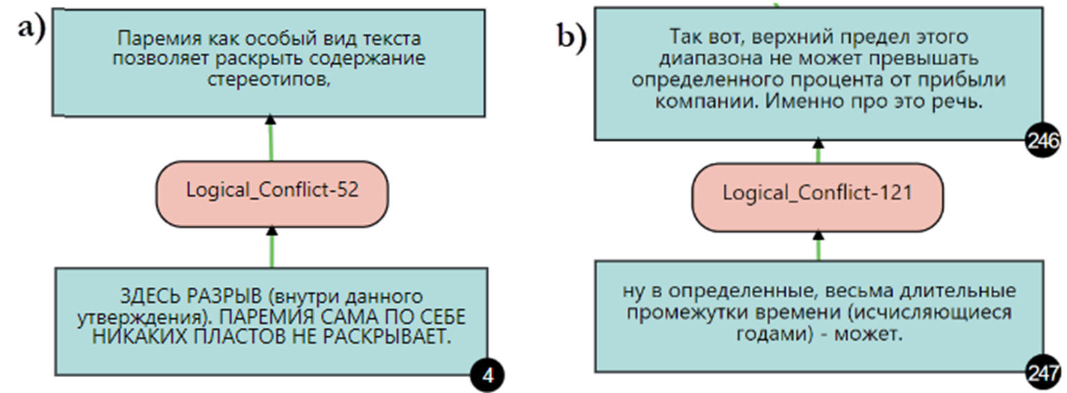 Атакующий приём «Логический Конфликт» приблизительно поровну представлен в обоих жанрах (см. рисунок 21). На рисунках 2а. 2b числа под утверждениями указывают на порядковый номер комментария к статье в источнике.