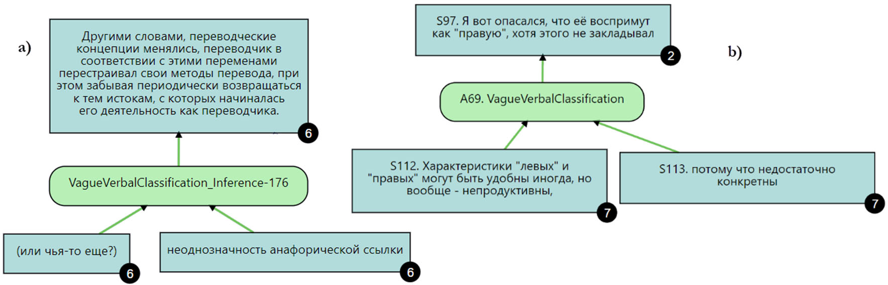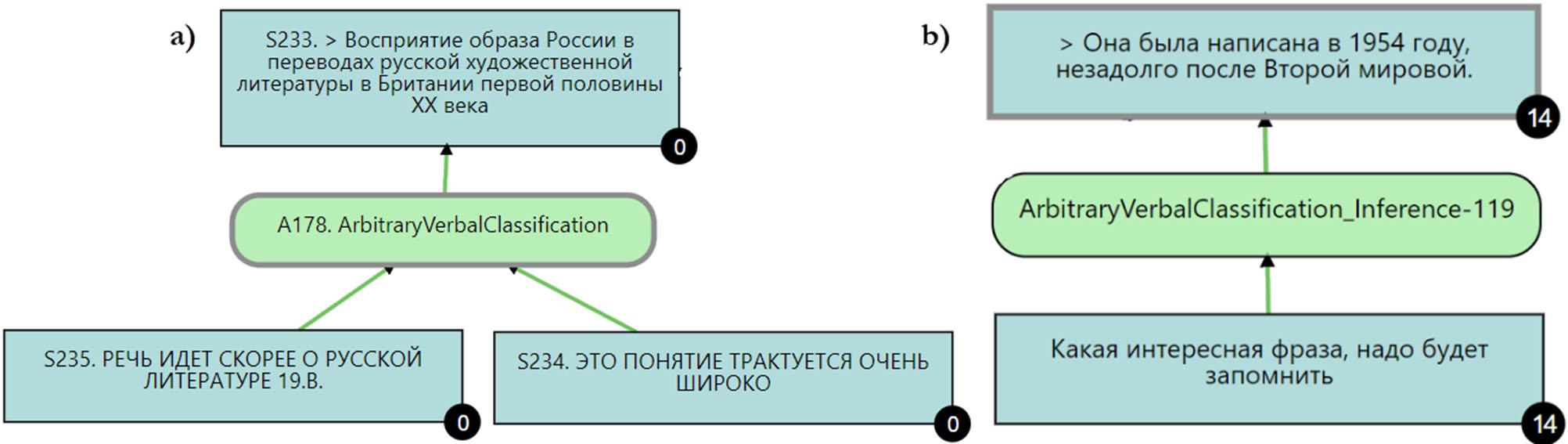 Можно выделить две основные задачи, необходимые для решения этих проблем. Во-первых, формальное представления множества схем с использованием формального языка, например, OWL – языка построения онтологий, – для строгого описания взаимосвязей компонентов аргументации с дальнейшим подключением поисковых сервисов [7]. Другая задача связана с построением классификаторов, позволяющих объединять модели или схемы аргументов в группы по значимым признакам. Такие классификаторы помогали бы как разметчикам при определении типа аргумента и выработке методологии разметки, так и разработчикам интеллектуальных систем анализа аргументации.