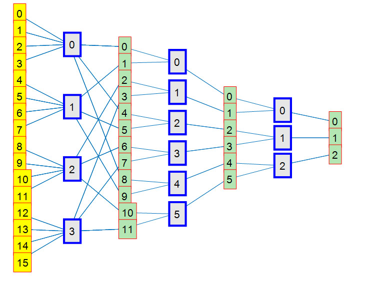 Данная сеть может обучиться к трём эталонным функциям, заданным на интервале длиной 16. Используя расчетную формулу (11), непосредственно из структурной модели получим . При произвольном выборе трёх функций необходимо задать 48 значений, что совпадает с полученным числом степеней свободы пирамидальной сети. Таким образом, рассматриваемая сеть является глубокой в том смысле, что её потенциал обучения используется полностью, и покрывает все допустимое многообразие эталонных сигналов.