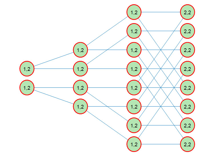 5.2. Пластичность самоподобной пирамидальной нейронной сети. Ключевая идея cамодобных пирамидальных нейронных сетей [9] заключается в изменении топологии БНС таким образом, чтобы выделить сетевые компоненты, информационная ёмкость которых используется полностью и отсечь компоненты, информационная ёмкость которых не используется при обучении, сохранив при этом условия самоподобия. В результате нейронная сеть упрощается, быстродействие её увеличивается, и глубина обучения становится максимально-возможной. На рис. 8 и рис. 9 показаны топологическая и структурная модели самоподобной пирамидальной нейронной сети. На структурной модели ранги всех связей равны 1.