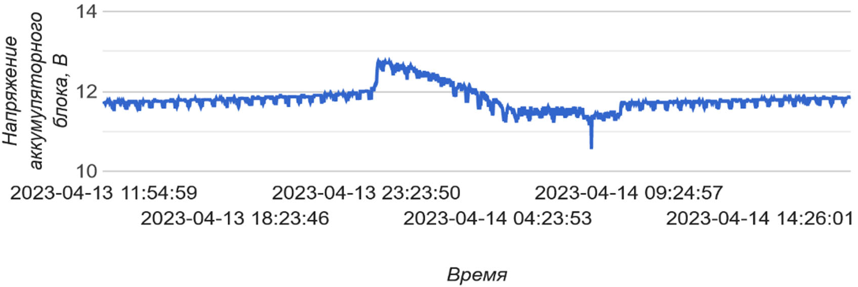 В ходе анализа накопленных данных было отмечено, что микросеть обеспечивает стабильную работу потребителей не только за счет использования генератора и газификатора, но и за счет отсутствия нагрузки в ночное время суток в большинстве случаев. Это существенно снижает уровень потребления. Также фиксировался стабильный уровень напряжения аккумуляторного блока (рис. 5).