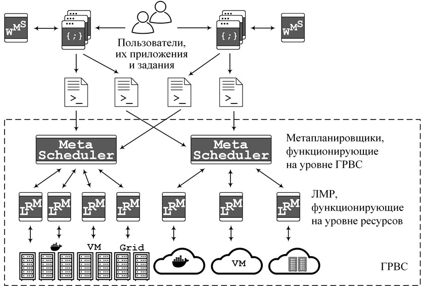 - уровень среды, на котором потоки заданий попадают в очередь метапланировщиков ГРВС, поддерживающих взаимодействие с выбранными ресурсами, и затем, в соответствии с дисциплинами диспетчеризации, им назначаются конкретные ресурсы;