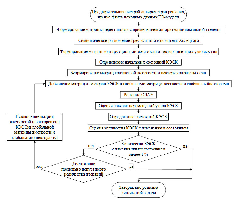 Смена состояний КЭСК в процессе статического или динамического анализа обусловливает итерационное решение контактной задачи с постепенным уточнением на каждой итерации состояния всех КЭСК. Блок-схема работы алгоритма решения контактной задачи МКЭ в статической постановке представлена на рис. 4.