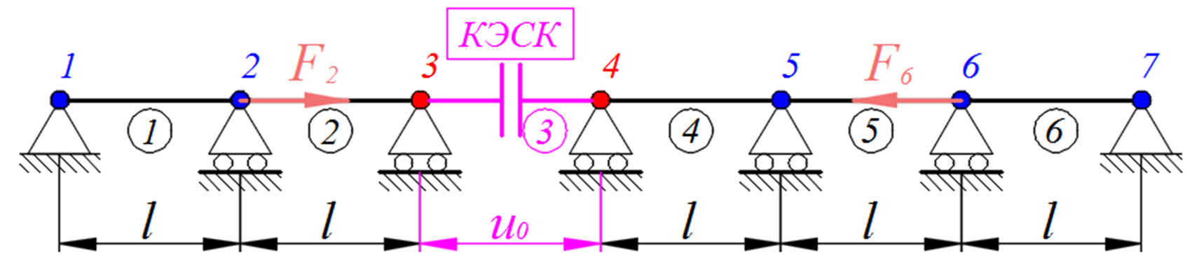 Для демонстрации указанной особенности рассмотрен пример, показанный на рис. 5 в виде системы из пяти стержневых конечных элементов (КЭ) с номерами 1, 2, 4-6 (номера КЭ обведены окружностями) с одинаковой продольной жесткостью k и одним КЭСК (№ 3) с осевой жесткостью kК, величина которой изменяется в зависимости от его состояния.