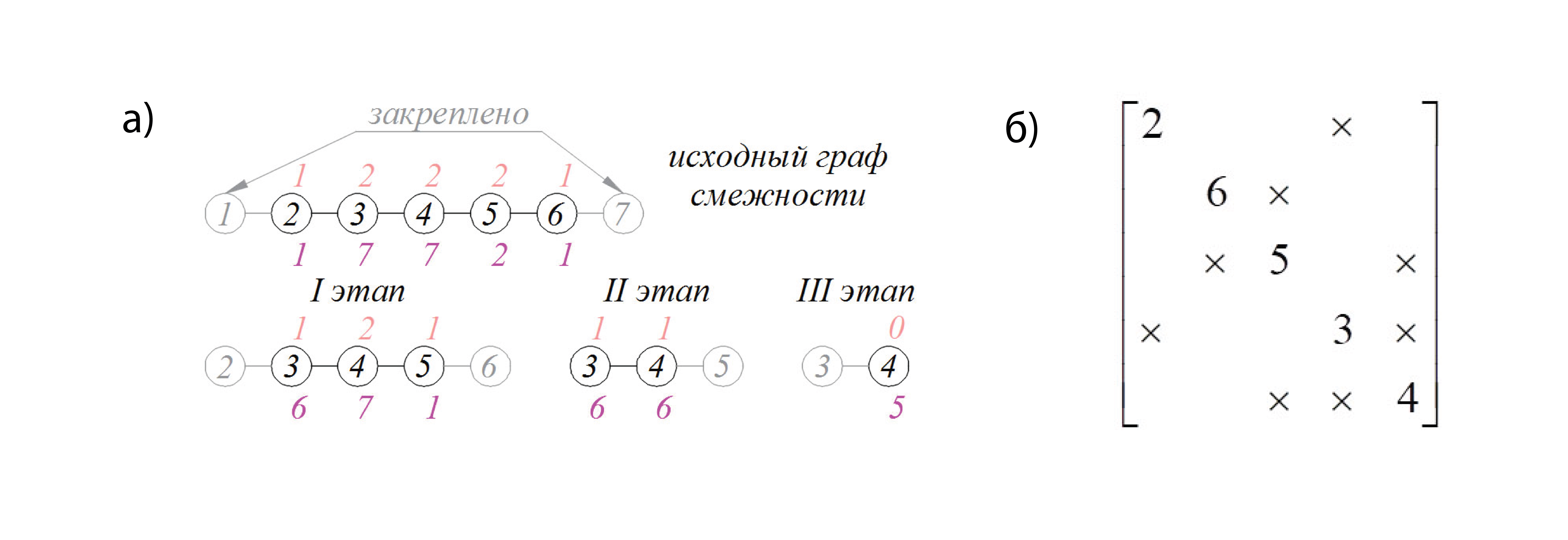 Узлы 1 и 7 в КЭ модели закреплены, поэтому соответствующие им строки вычеркнуты из матрицы, а соответствующие узлам вершины – исключены из графа смежности до начала работы АМС. На первой итерации АМС определяются естественные степени вершин графа, показанные на рисунке над вершинами красным цветом. После этого модифицированным АМС определяются вершины, ассоциированные с узлами КЭСК, и к степеням этих вершин прибавляется размерность матрицы (равная пяти) так, чтобы полученные величины степеней были самыми большими в графе. Модифицированные степени показаны под графом смежности малиновым цветом. Затем, в соответствии с работой АМС, из графа исключаются вершины 2 и 6, степень которых минимальна и равна единице. На второй итерации модифицированного АМС пересчитываются реальные степени оставшихся вершин; к степеням вершин, ассоциированных с узлами КЭСК, прибавляется размерность матрицы; после этого исключается вершина 5, степень которой минимальна и равна единице. Аналогично проводится третья итерация, в ходе которой исключаются последние вершины 3 и 4. Портрет матрицы после упорядочения модифицированным АМС показан на рис. 6б.