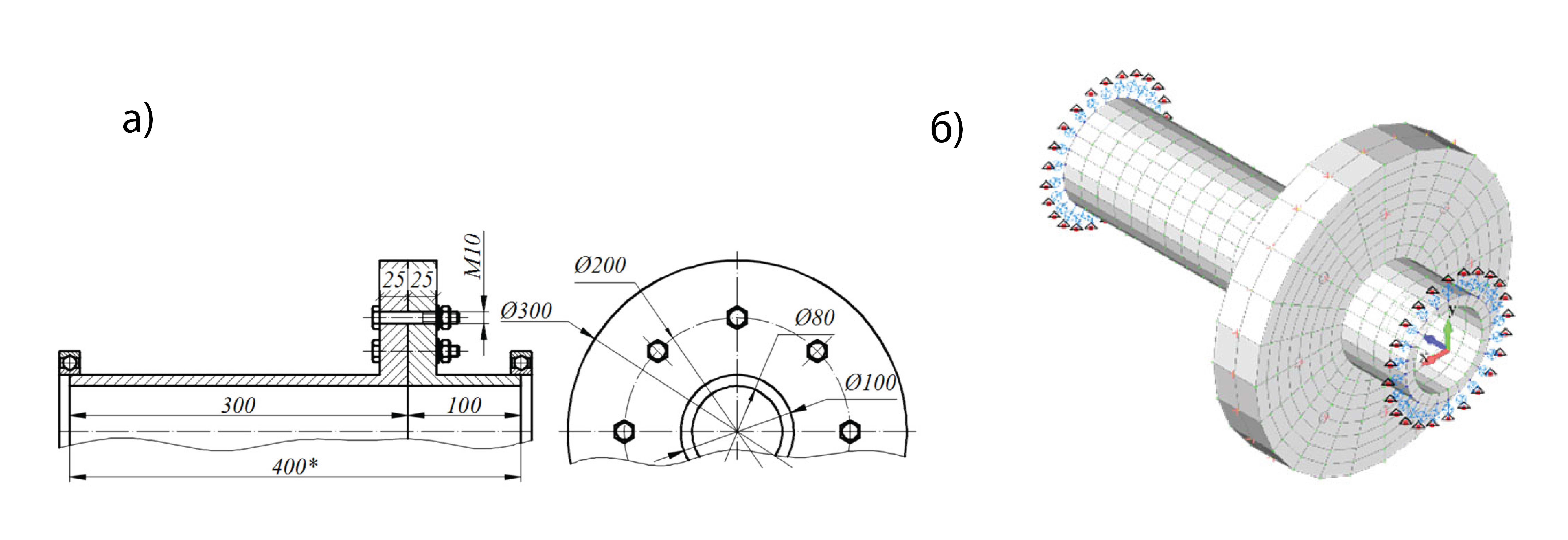 Численный эксперимент и анализ эффективности вычислительного алгоритма на конечноэлементных моделях сборных роторных систем. Для тестирования эффективности модифицированного АМС была разработана КЭ модель сборного ротора, эскиз которой показан на рис. 7а. Моделирование основных деталей ротора реализовано с применением КЭ типа «изопараметрический гексаэдр», контактных сопряжений – с применением КЭСК, моделирование крепежа деталей – с применением КЭСК, балочных КЭ Тимошенко и КЭ типа «невесомый стержень», а моделирование упругих опор – с применением упруго-демпферных КЭ [8]. КЭ модель представлена на рис. 7б.