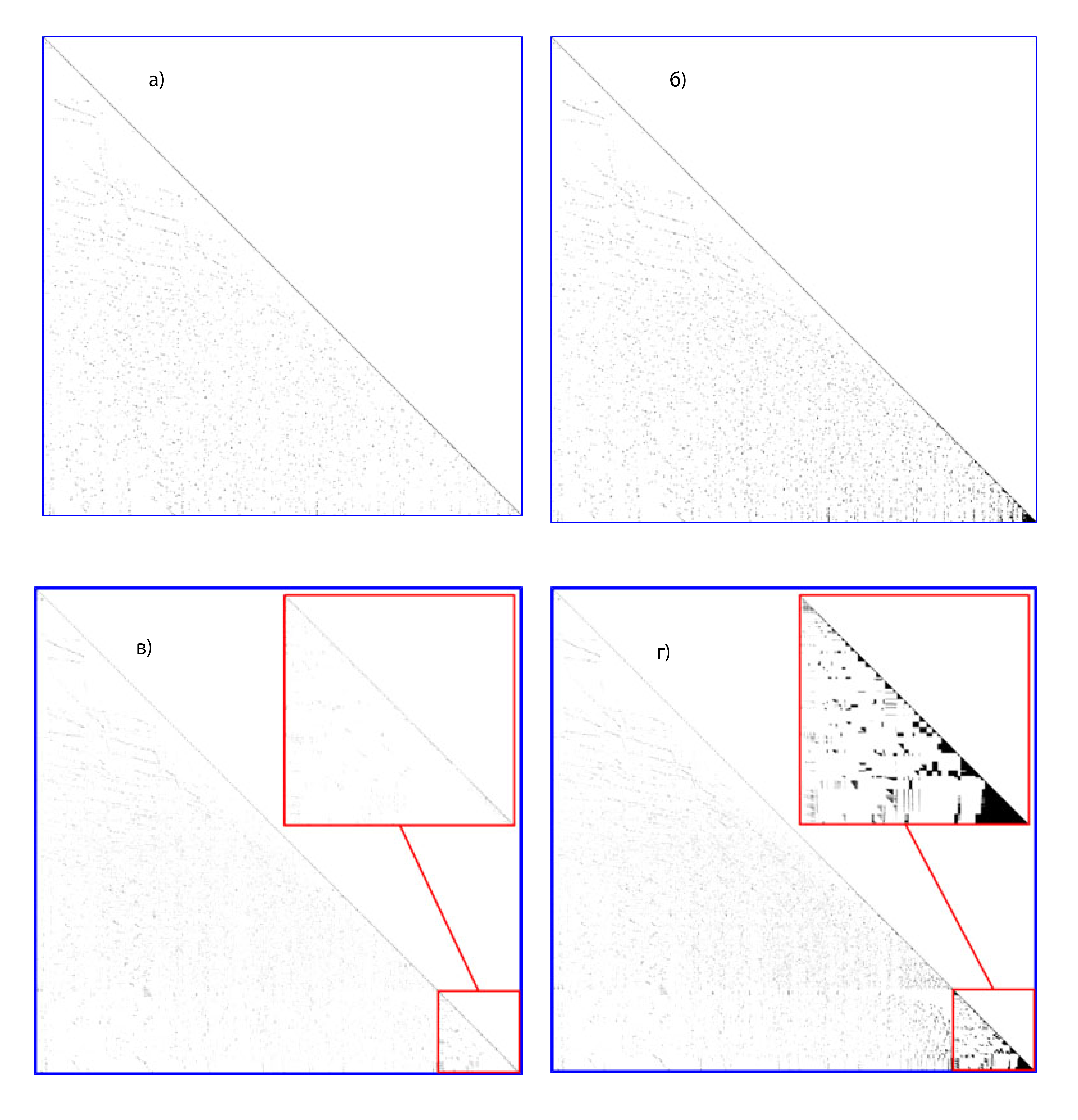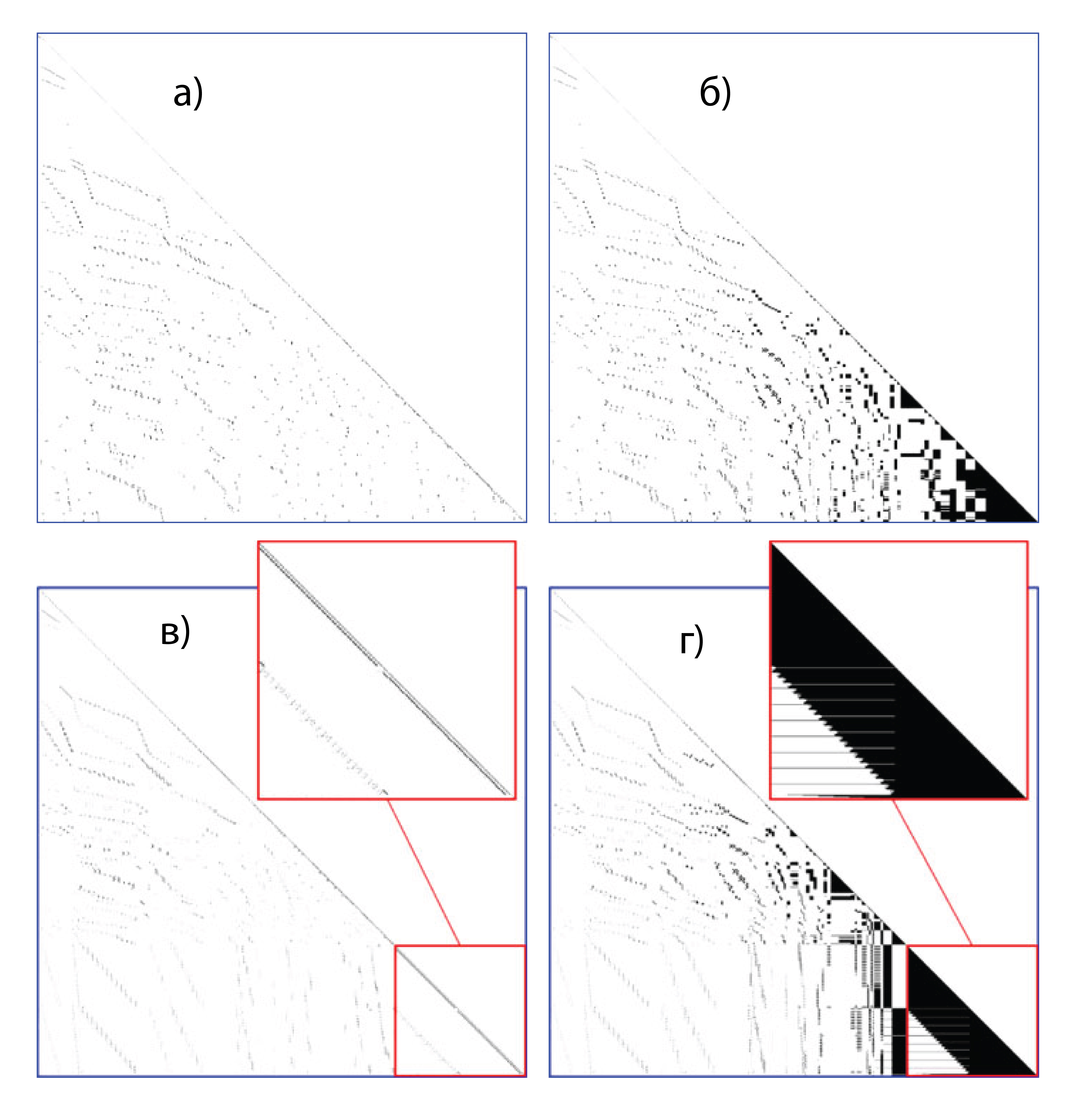 Однако количество арифметических итераций и время повторных разложений оказываются несоизмеримо меньшими времени первой итерации. На рис. 8в и рис. 8г соответственно дополнительно выделены красным цветом портреты повторно раскладываемой части исходной матрицы и треугольного множителя Холецкого.
