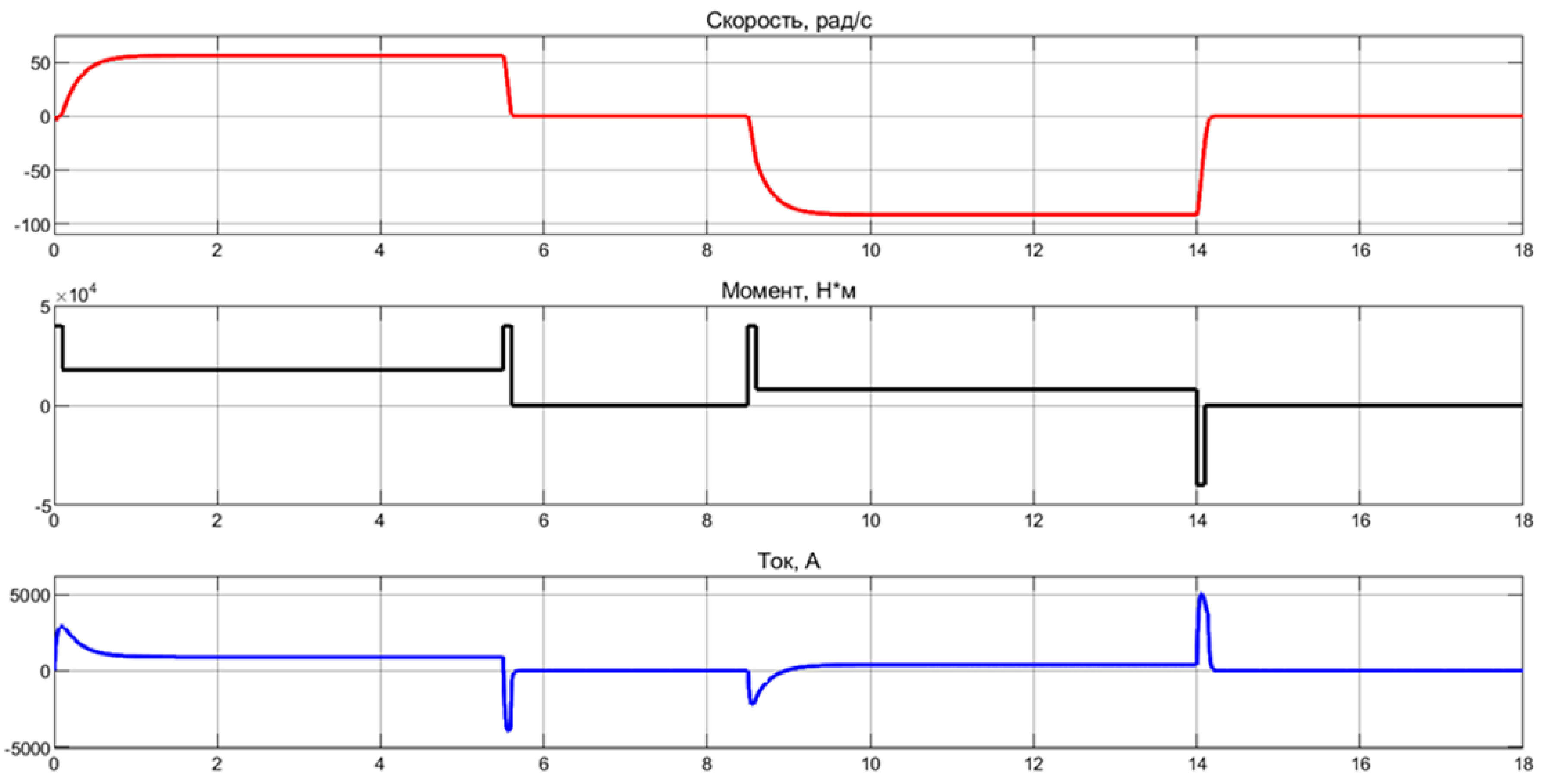 Рис. 5. Переходные процессы в модели электропривода механизма подъема ковша шагающего экскаватора с частотно-импульсным управлением