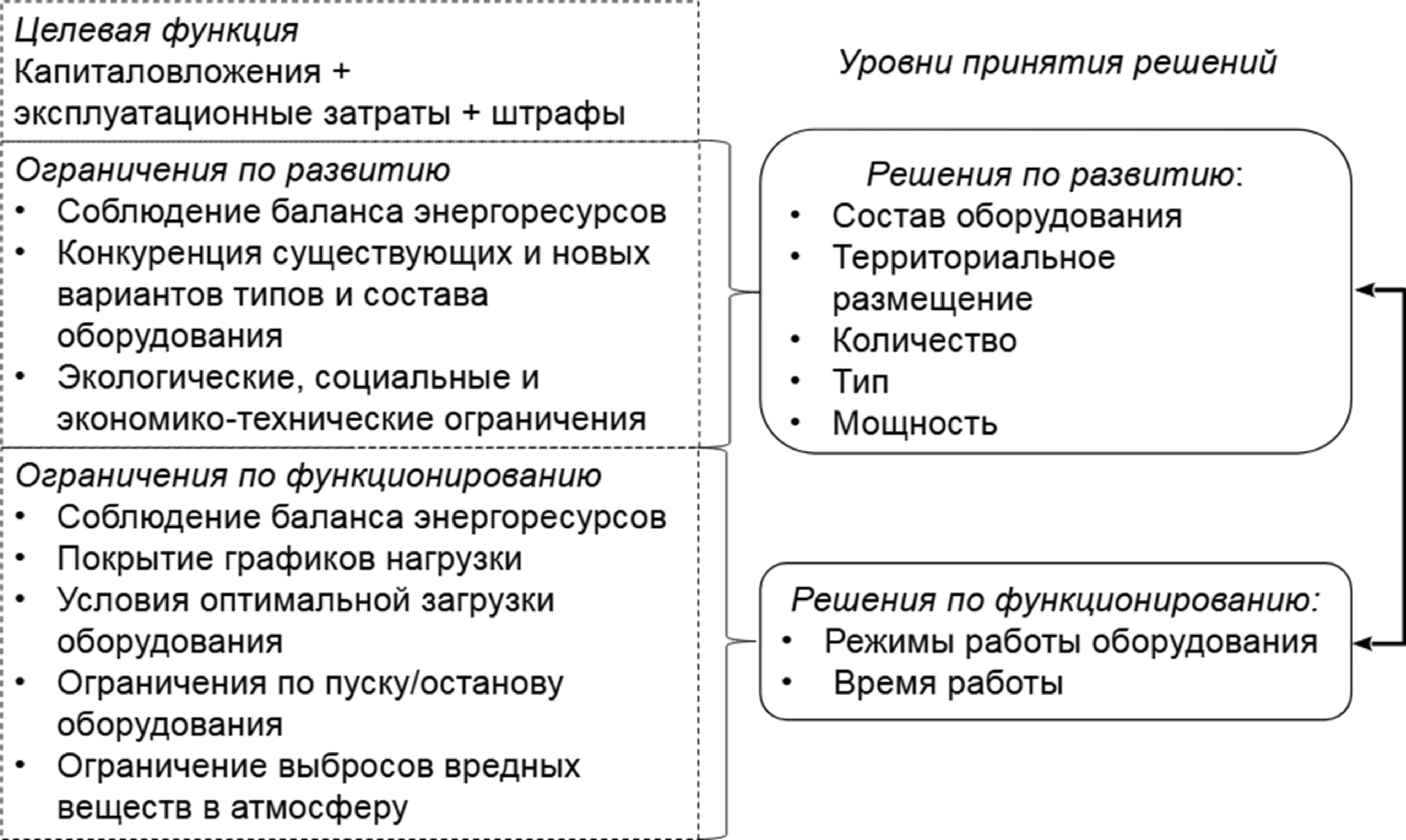 Проблемы структурно-параметрической оптимизации микросетей. Двухуровневая организация планирования решений о развитии и функционировании микросетей в задаче их структурно-параметрической оптимизации показана на рис. 2. На верхнем уровне принимаются решения об инвестициях в оборудование и его размещении, в то время как на нижнем уровне определяются оптимальные режимы работы выбранного оборудования [6]. Решения по развитию и функционированию микросетей принимаются согласованно. Вычислительная сложность задачи структурно-параметрической оптимизации возрастает снизу вверх [7].