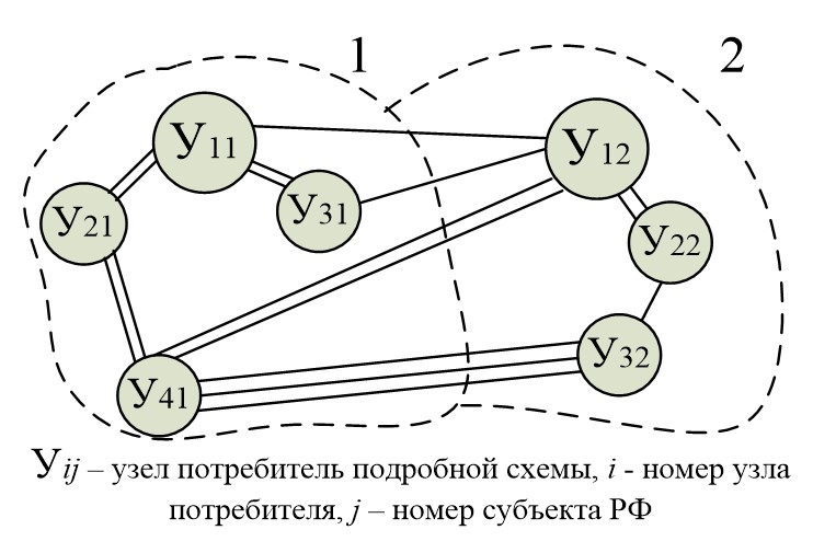 Обычно укрупненные расчетные схемы по системе создаются экспертным методом: на карту рассматриваемого региона наносятся основные потребители и источники газа, а также основные потоки газа и точки их пересечения. Схемы, созданные таким методом, обычно слишком упрощены и недостаточно точно раскрывают особенности газоснабжения некоторых регионов и субъектов страны. Существуют методы определения технико-экономических показателей для подробных [1, 2] и расчетных укрупненных схем [1, 3-5]. Так, в [2] описаны структура, состав и определение основных показателей объектов газоснабжающей системы, при этом они обычно рассчитываются как усредненные величины. В [3, 4] показаны подходы к укрупнению показателей из нижележащего уровня иерархии в более высокий уровень, используется метод сверток частных значений показателей. В [5] рассматривается итеративное агрегирование, согласно которому изучаются особенности системы, статистические данные и далее определяются основные показатели системы, задаются их весовые коэффициенты, с помощью которых и рассчитываются агрегированные характеристики. Использование этого метода ограничено невозможностью сбора огромного количества подробной исходной информации по системе.