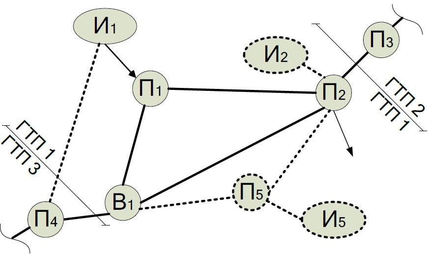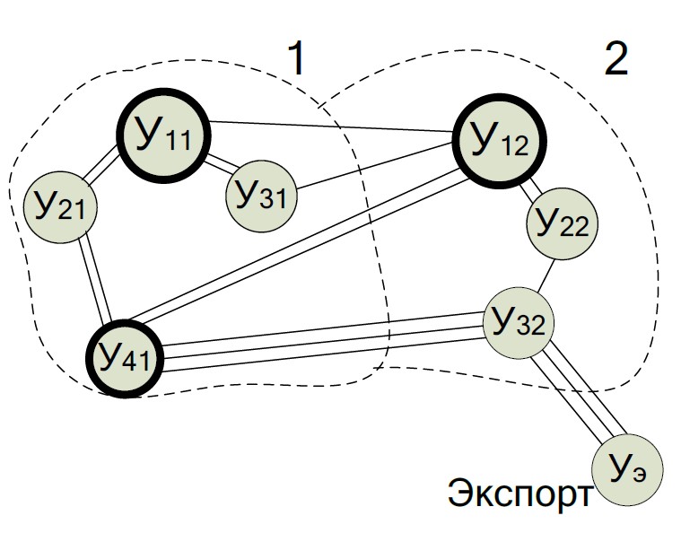 Обозначение в каждом субъекте основных узлов ветвления. Выделяем на схеме узлы, из которых потоки идут в трех направлениях и более (количество смежных узлов≥3) |