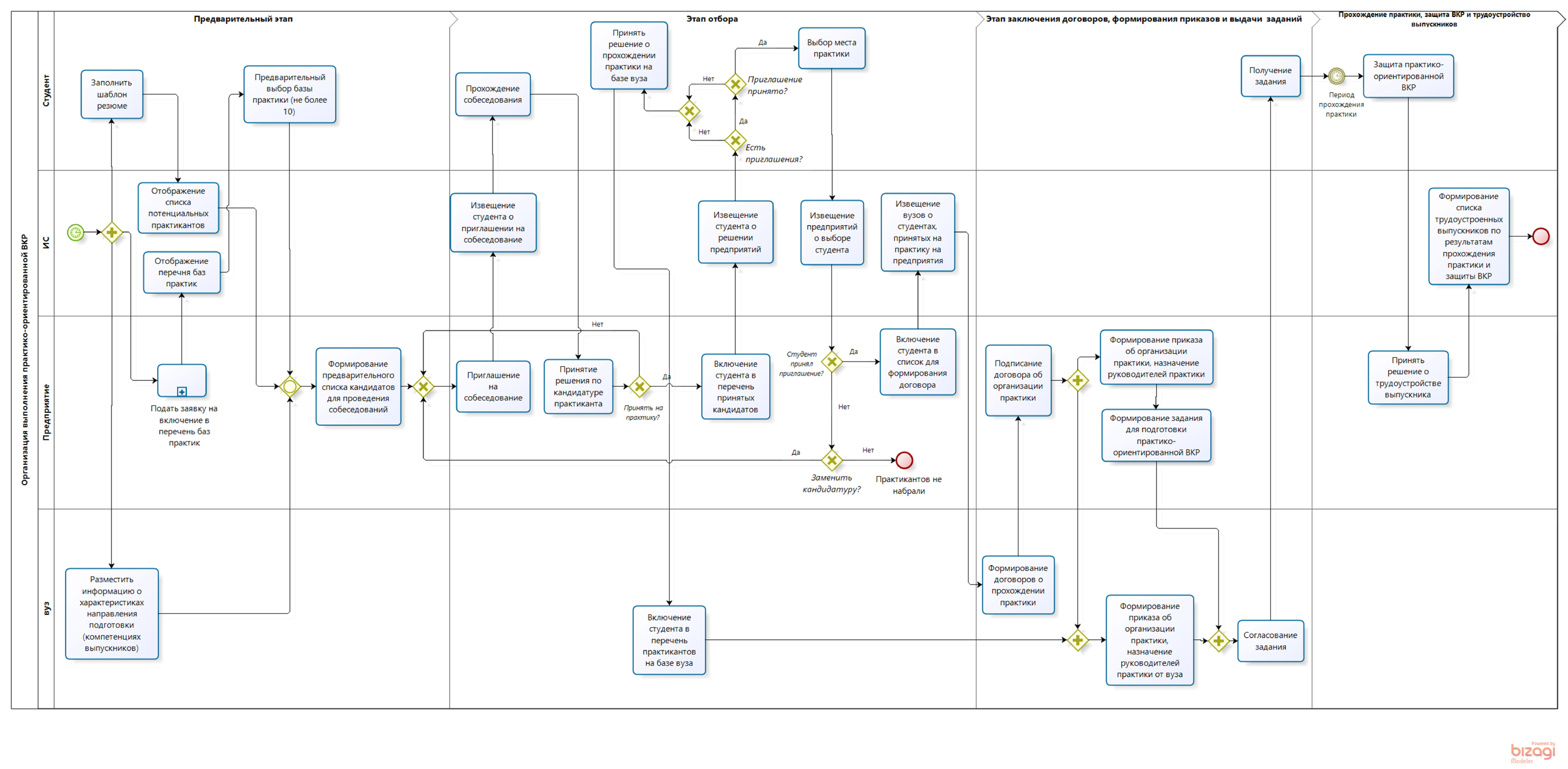 Условно в описании алгоритма принято, что практика студентов осуществляется в последнем семестре обучения, а после ее окончания следует государственная итоговая аттестация в форме защиты ВКР.