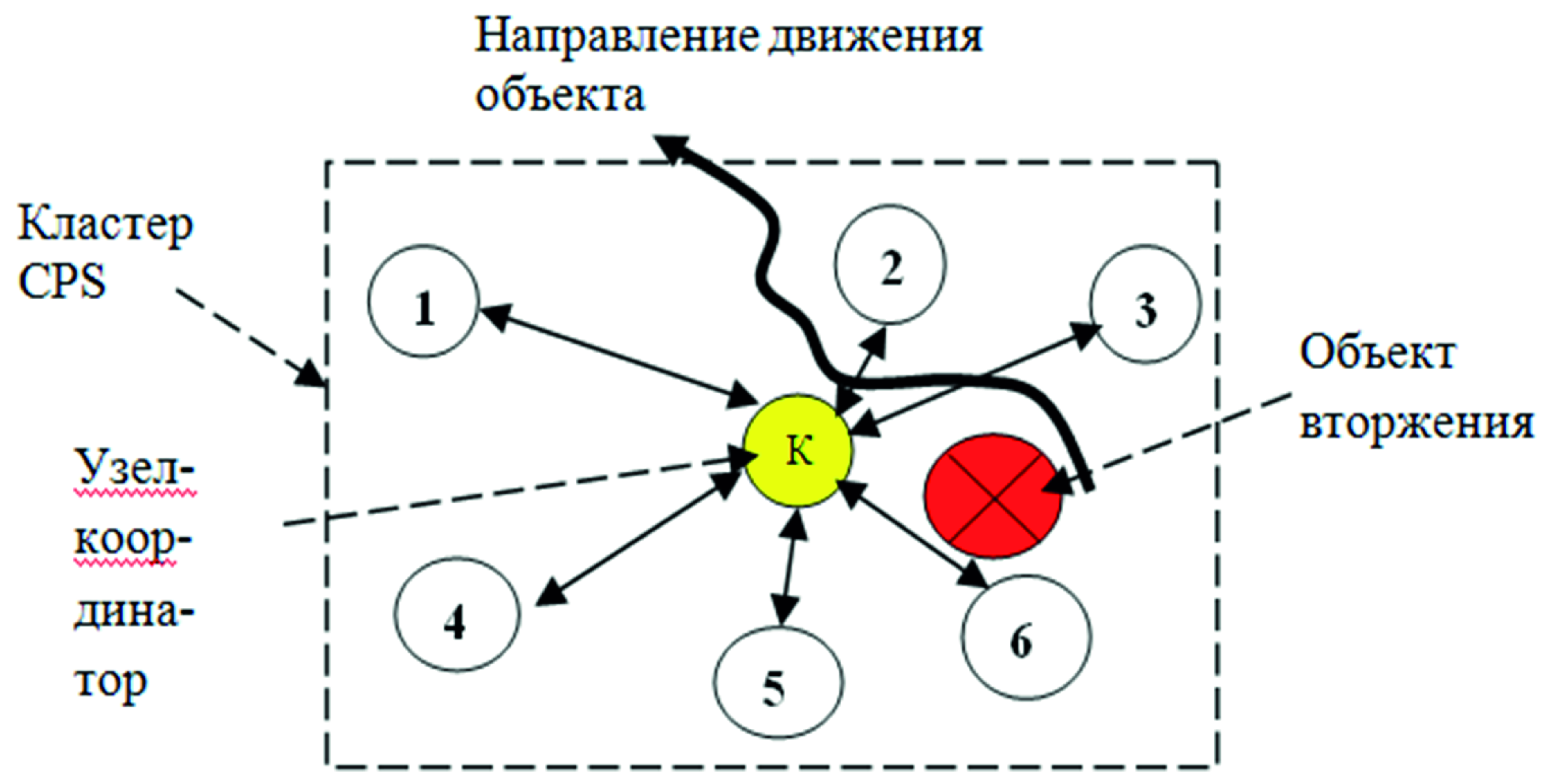 - Обнаружение и локализация вторжения. Одной из важнейших функциональностей узлов РБСС является реализация двух задач: обнаружение объекта и локализация его в пространстве [10, 16]. Если, по крайней мере, три интеллектуальных узла (ИСУ) фиксируют событие проникновения, то для локализации объекта вторжения можно использовать эффективный метод триангуляции для локализации объекта. Три сенсора с достаточной степенью точности локализуют объект [20].