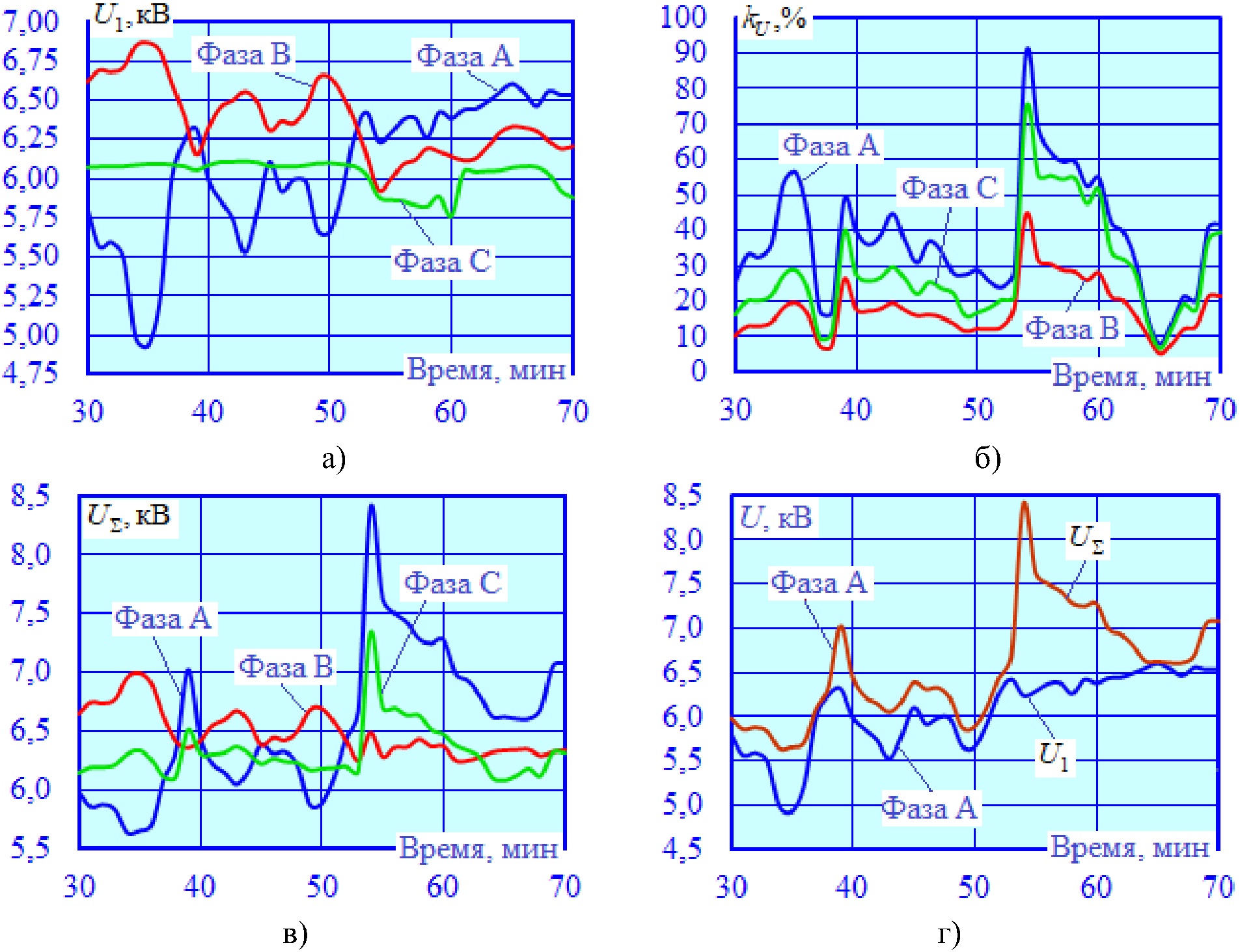 Результаты моделирования проиллюстрированы на рис. 4–8. Исходный, доаварийный режим представлен на рис. 4, на котором приведены графики зависимостей от времени t следующих параметров: напряжений основной частоты U1 = U1 (t), суммарных коэффициентов высших гармоник (ВГ) kU = kU (t), эффективных величин с учетом ВГ UΣ = UΣ (t). На рис. 4г показаны графики, иллюстрирующие сравнение U1 = U1 (t) и UΣ = UΣ (t).