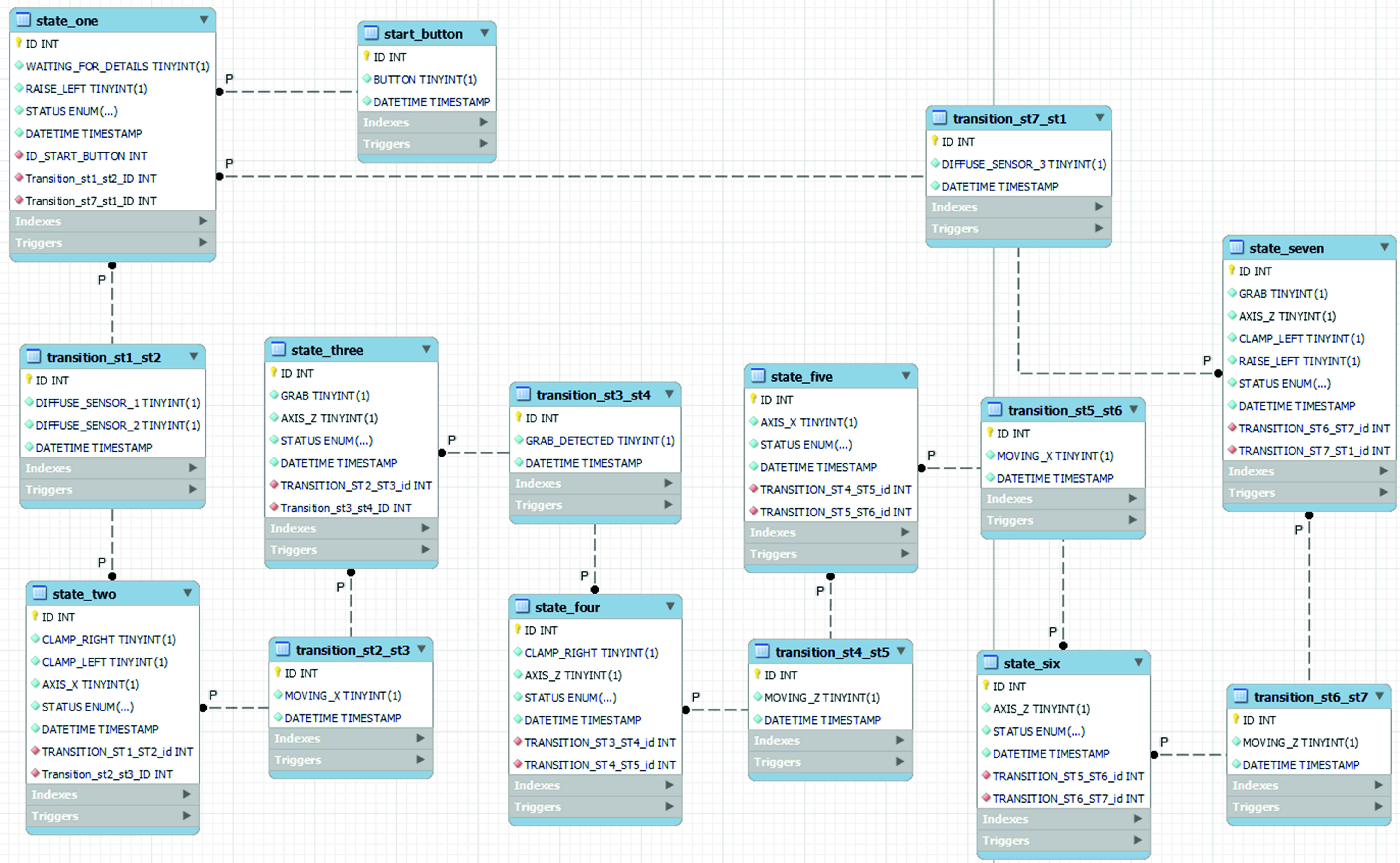 Применение триггеров в MySQL для автоматизации переходов между состояниями продемонстрировало, как можно эффективно реализовать логику переходов на уровне базы данных. Такой подход позволяет быстро реагировать на события, поступающие от датчиков и оборудования, обеспечивая непрерывность и последовательность выполнения операций. В статье рассмотрена структура триггеров для управления состояниями и переходами на примере технологического процесса сборки изделий, что иллюстрирует практическое применение теоретических основ конечных автоматов в автоматизированных системах управления. Кроме того, использование реляционной базы данных в качестве платформы для моделирования конечного автомата открывает возможности для интеграции системы управления с другими информационными и аналитическими системами [11, 12]. Данные о текущих и прошлых состояниях, переходах и ошибках могут использоваться для анализа производственных процессов, выявления узких мест и оптимизации работы оборудования [13]. Таким образом, реализация конечного автомата на SQL предоставляет не только инструменты для управления технологическим процессом, но и данные для его совершенствования.