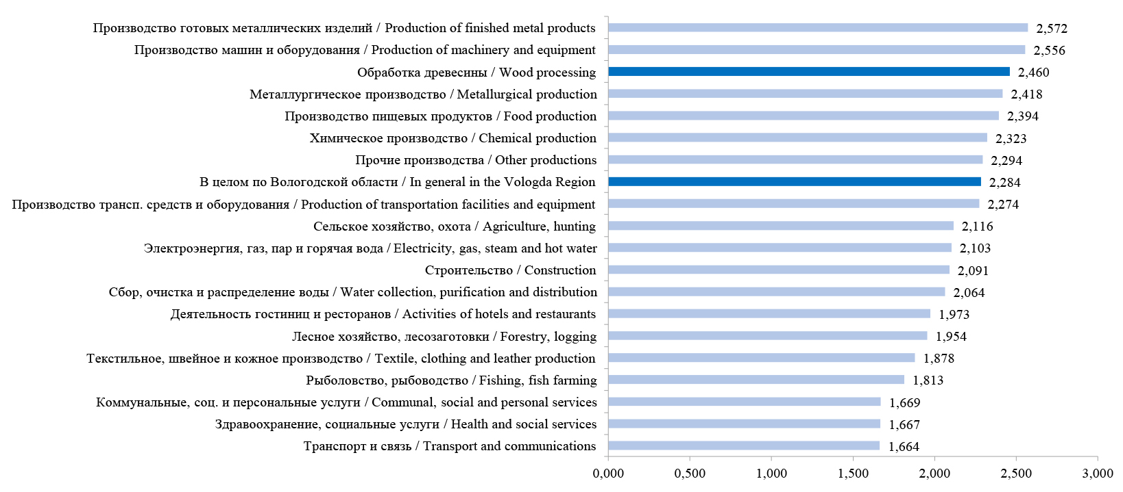 Прирост ВРП Вологодской области составит 0,13 %. Эффекты скажутся и на других социально-экономических параметрах, например, на росте на 439,6 чел., занятых в производстве. Изменения коснутся фонда оплаты труда, прирост которого составит почти 8,5 млн руб. Стоит отметить, что значение показателя величиной в 2,46, отражающего изменение выпуска в результате импульса, полученного от увеличения спроса на деревообрабатывающую продукцию, как следует из рисунка, довольно высоко. Таким образом, результаты проведенного моделирования демонстрируют значимость для роста экономики региона предлагаемых мероприятий, а именно реализации проектов по строительству гостиниц с использованием технологий CLT-панелей на территории региона.
