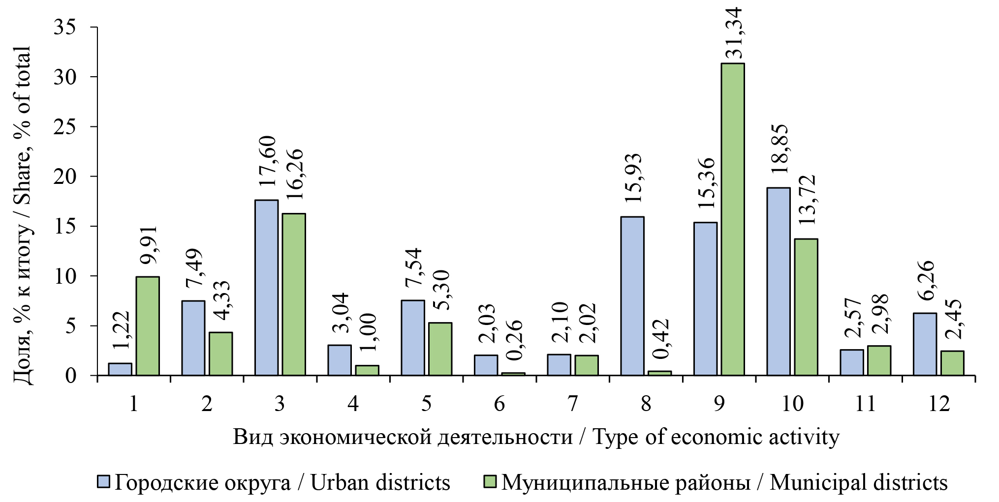 F i g. 1. Sectoral structure of the economy of urban districts and municipal districts of the Republic of Crimea (by the number of people employed in the economy, excluding small and medium-sized businesses) in 2022