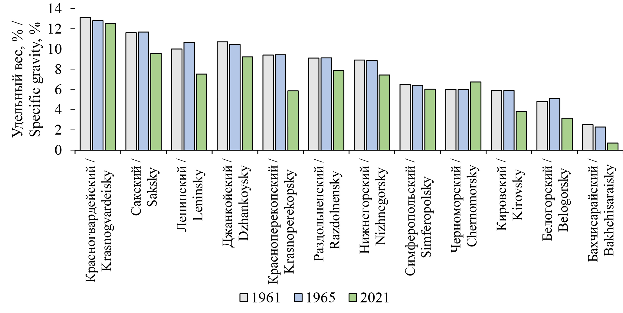 Из 12 сельских территорий Крыма за 60 лет в меньшей степени изменились позиции 6 территорий (Красногвардейского, Джанкойского, Раздольненского, Нижегорского, Симферопольского, Белогорского районов) благодаря эффективному развитию сельскохозяйственного производства, основанного на использовании уникальных природных ресурсов и условий. В частности, за 60-летний период (с 1961 по 2021 г.) сохранил свои лидирующие позиции в общерегиональном значении по показателю «общая посевная площадь сельскохозяйственных культур» Красногвардейский муниципальный район – от 12,52 % в 2022 г. до 13,10 % в 1961 г.