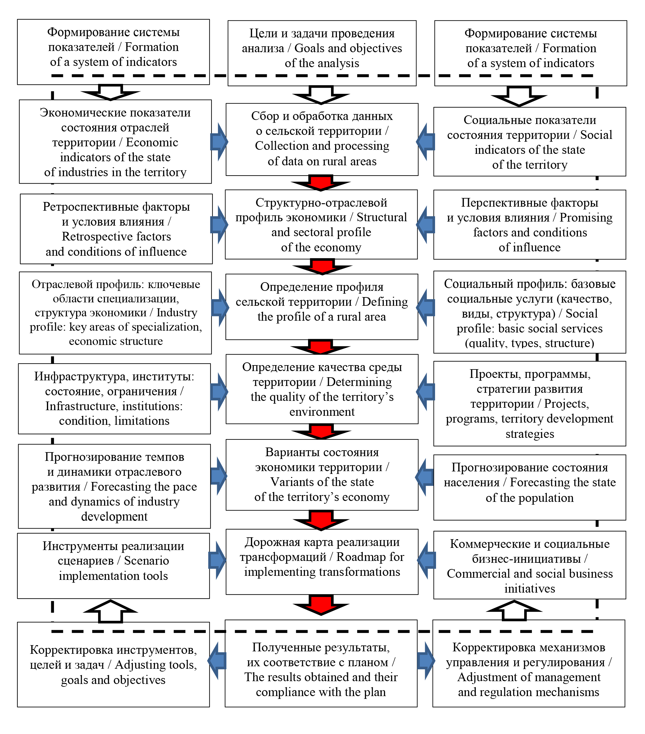 Вначале формулируются цели, задачи и показатели оценки, определяются ведущие социально-экономические тенденции, затем осуществляется построение структурно-отраслевого профиля, что позволяет сформировать сценарии развития сельской территории с последующей разработкой дорожной карты, описанием конкретных мер, проектов и инструментов ее реализации.