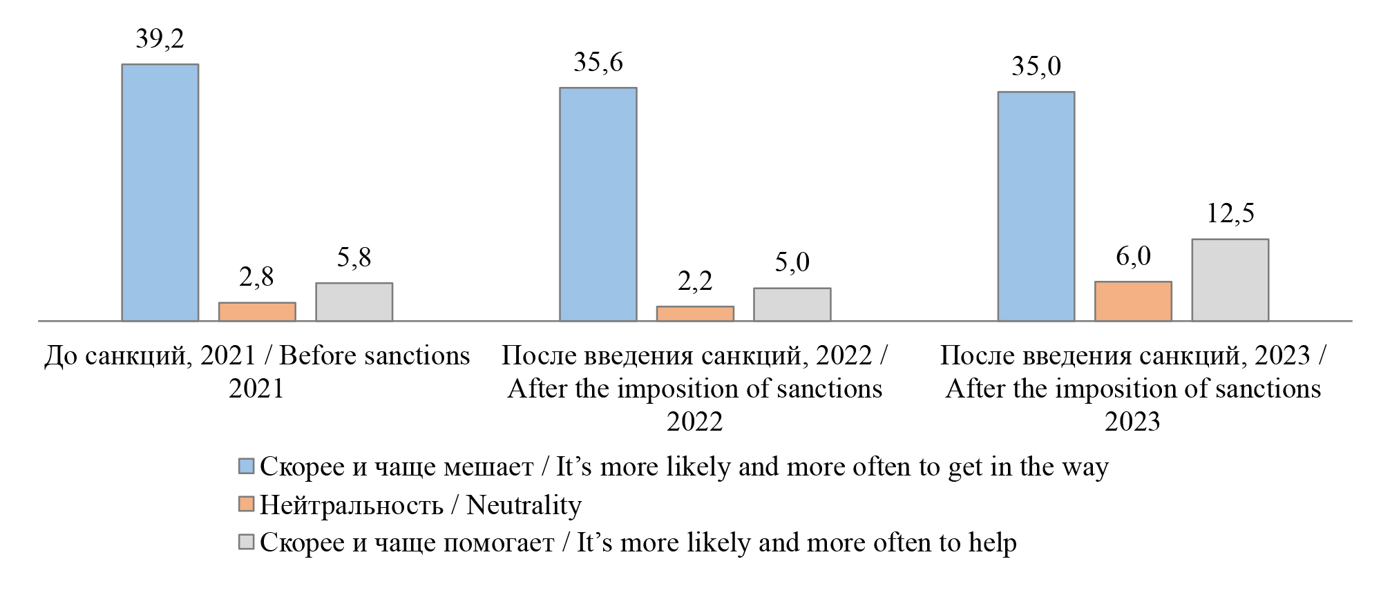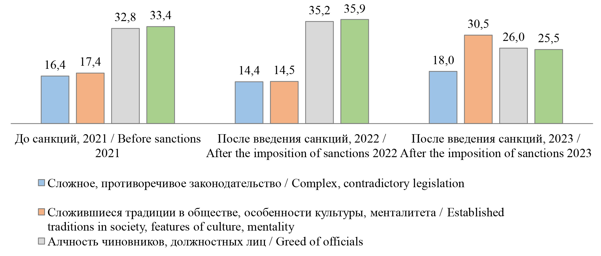 Заметим, что расширение масштаба экономических санкций осознается бизнес-сообществом как фактор, мешающий осуществлению эффективной работы предприятий. В условиях осознания негативного влияния международных санкций сохраняется общее негативное отношение к коррупции среди российского делового сообщества.