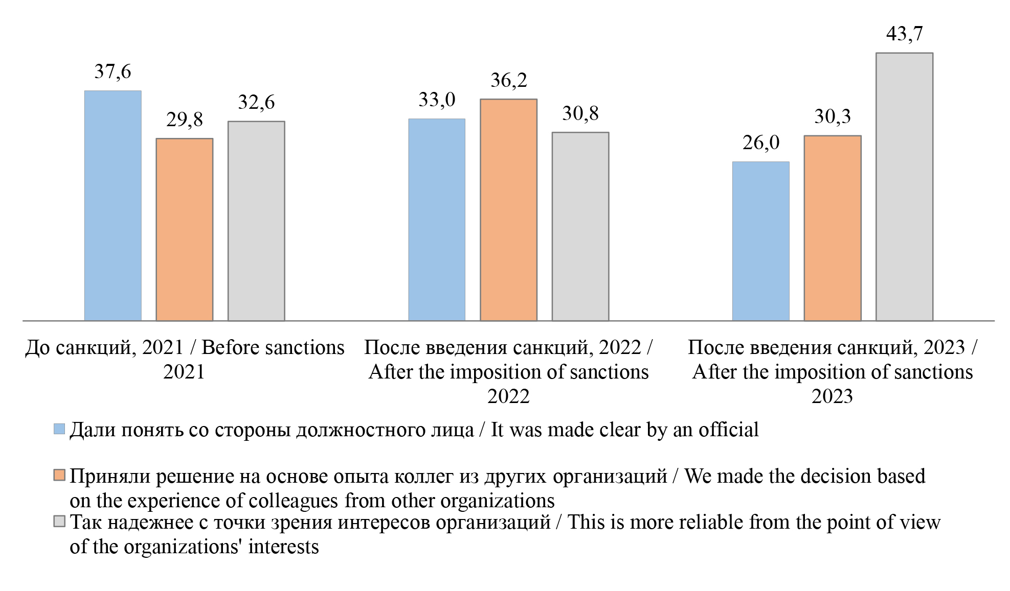3) в 2023 г. выросла мотивация, связанная с фактором обеспечения спокойствия для интересов организации, «так надежнее» (с 32,6 % в 2021 г., 30,8 ‒ в 2022 и до 43,7 % в 2023 г.) (рис. 3).