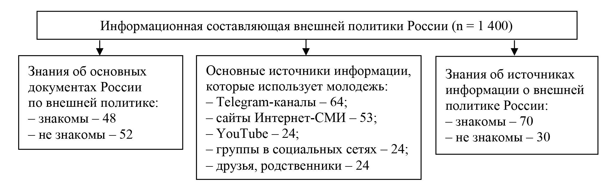 Изучение отношения различных групп населения к российскому внешнеполитическому вектору проводится и на уровне всероссийских опросов (ФОМ, ВЦИОМ, Институт социологии РАН и др.), но практически отсутствуют региональные исследования, в том числе среди молодежи. Нашим авторским коллективом с 2023 г. проводятся теоретические изыскания и социологические исследования внешнеполитических ориентаций молодежи [1; 28‒30], так как в современных условиях для России необходимо найти основу в лице россиян, разделяющих и принимающих проводимый внешнеполитический курс страны, что составит фундамент, на котором будет строиться внешняя политика России с опорой на поддержку всего общества.