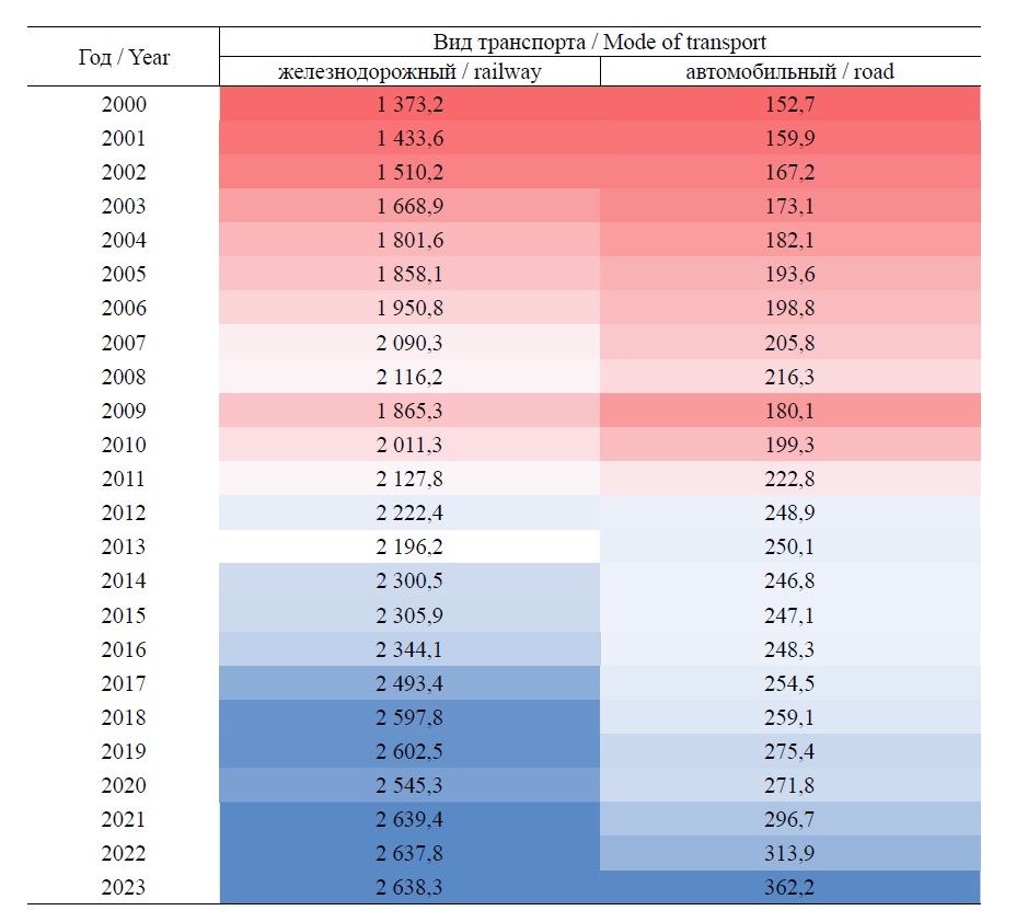 Table 1. Dynamics of development of freight transportation by rail and road transport in 2000–2023, million tons