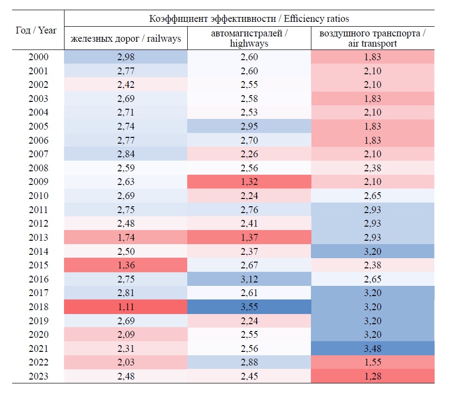 Table 2. Efficiency coefficients of the transport system and air transport of the Russian Federation