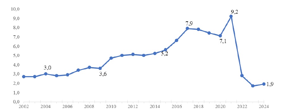 13 Таблицы 1, 2 и рисунок подготовлены автором по данным: Федеральная служба государственной статистики. Транспорт [Электронный ресурс]. URL: https://rosstat.gov.ru/folder/23455?print=1 (дата обращения: 10.02.2025).